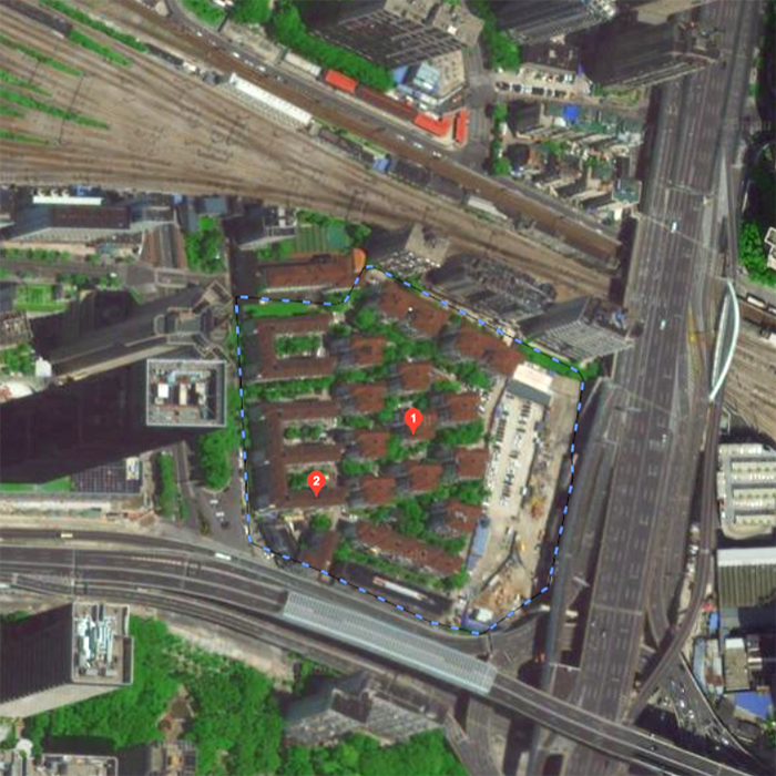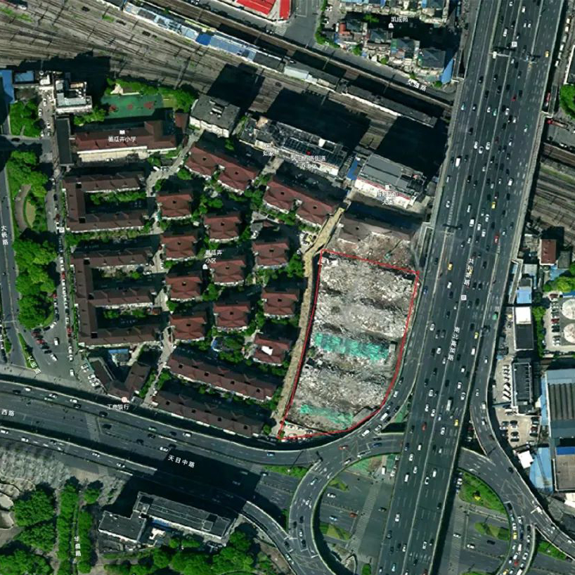俯瞰如今蕃瓜弄(蓝色虚线内)。今日的蕃瓜弄小区东起南北高架路,西邻大统路,南沿天目中路,北靠沪宁、沪杭铁路沿线,占地6.05公顷。图片来源:百度地图