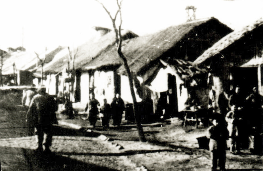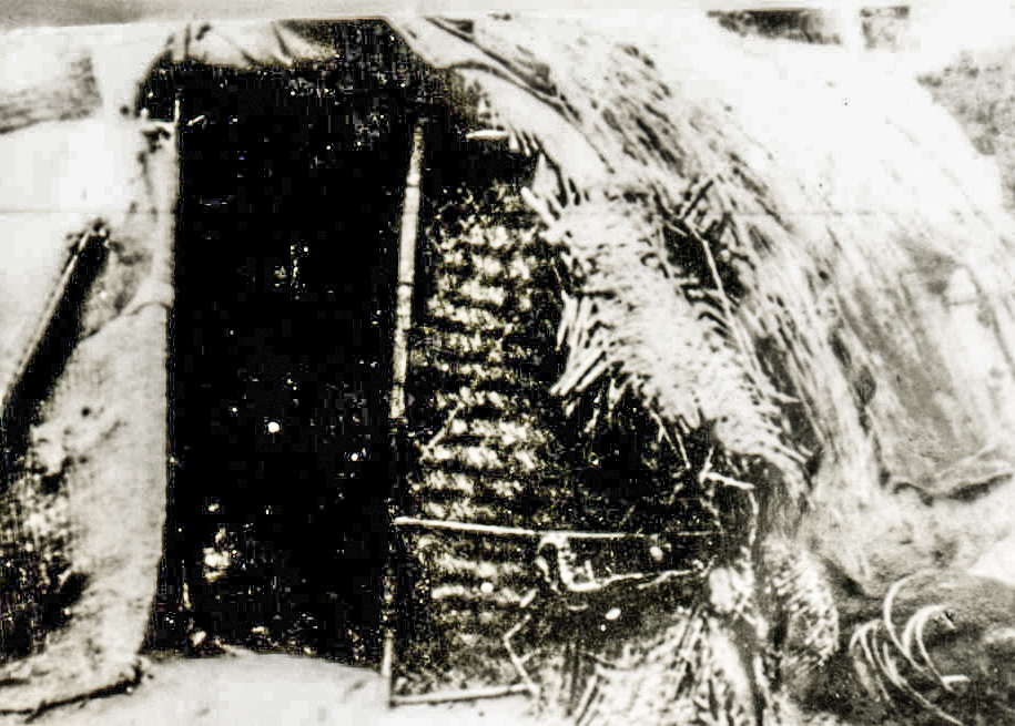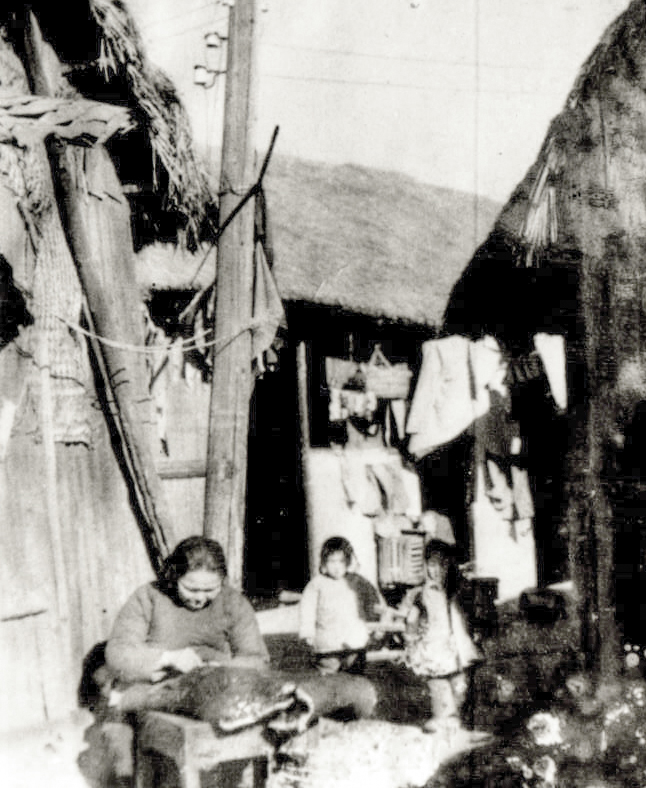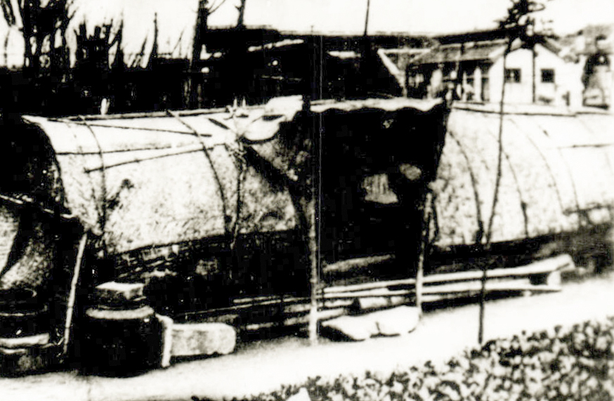 1940年代的“滚地龙”。一条芦席卷成半圆,固定在支起的竹竿上,形成简易窝棚。