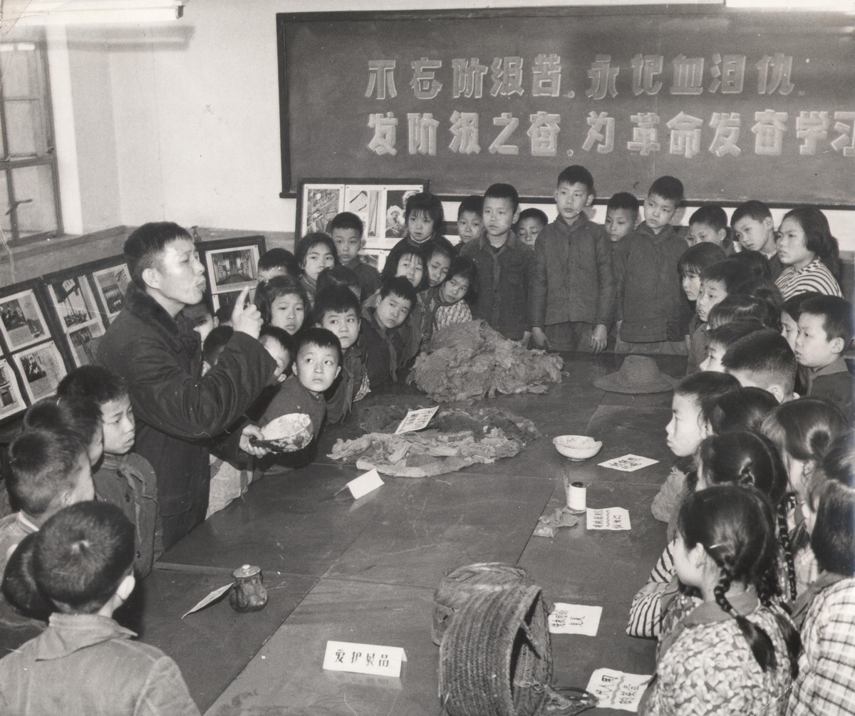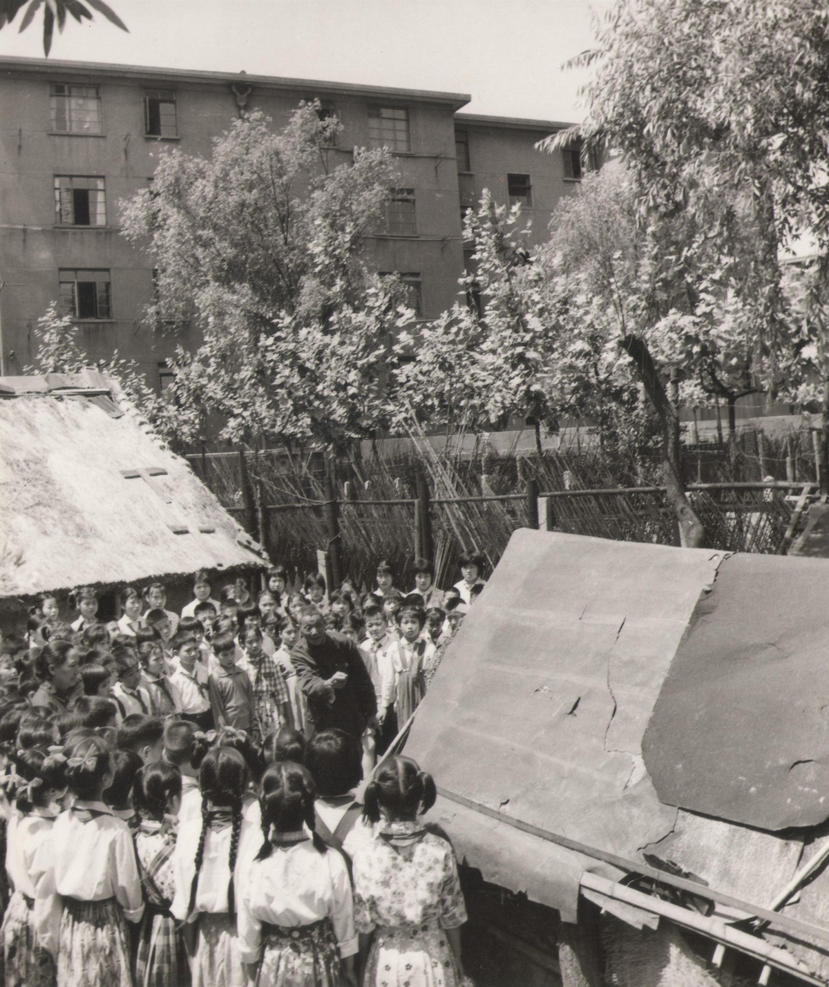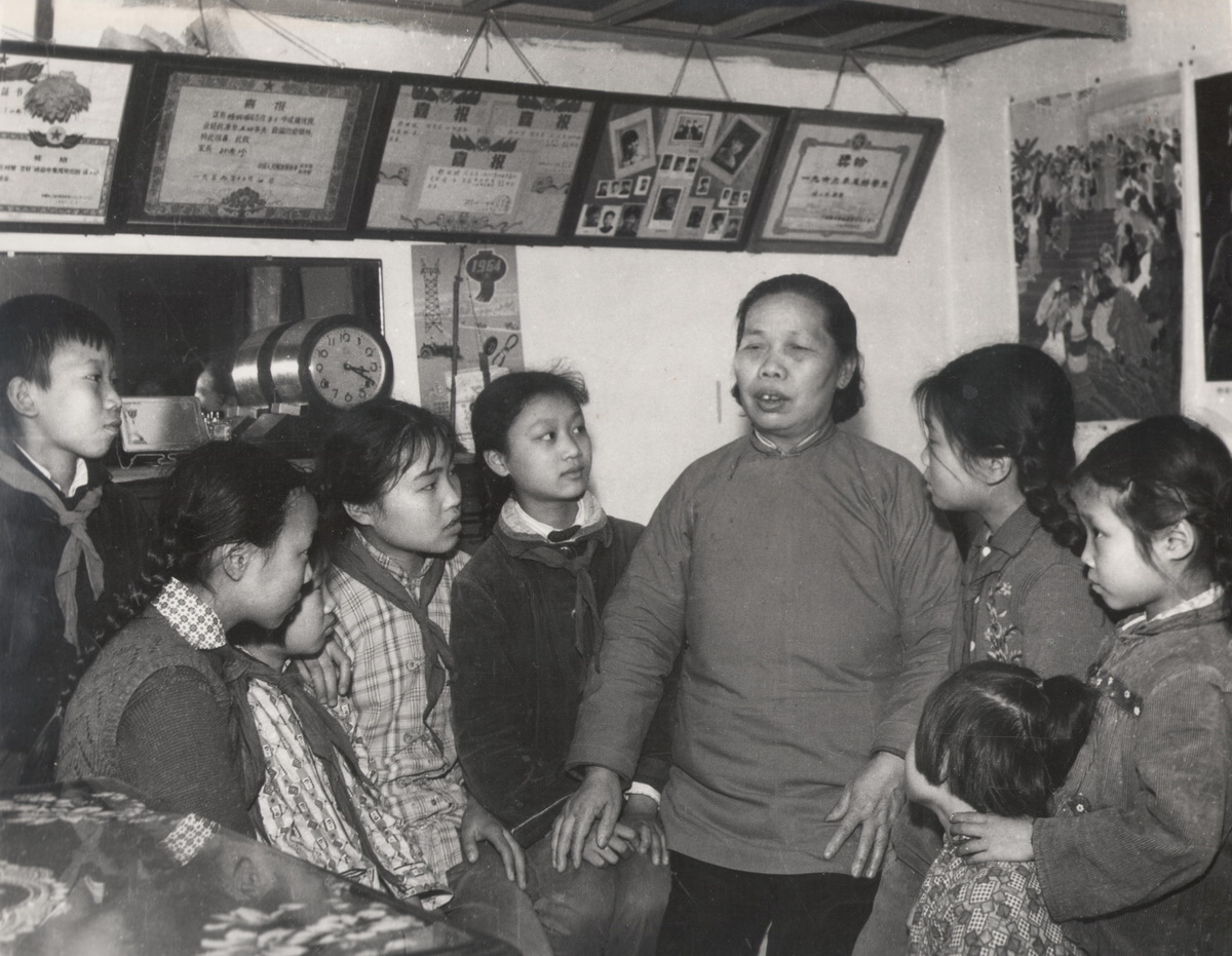 1970年代,蕃瓜弄新村,小学生听老师讲解“滚地龙”的故事。