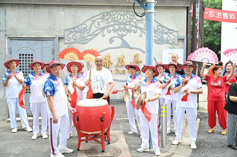 2023年7月2日,蕃瓜弄小区居民在大门前敲锣打鼓,庆祝旧住房改建项目签约率达100%。澎湃新闻记者张呈君图