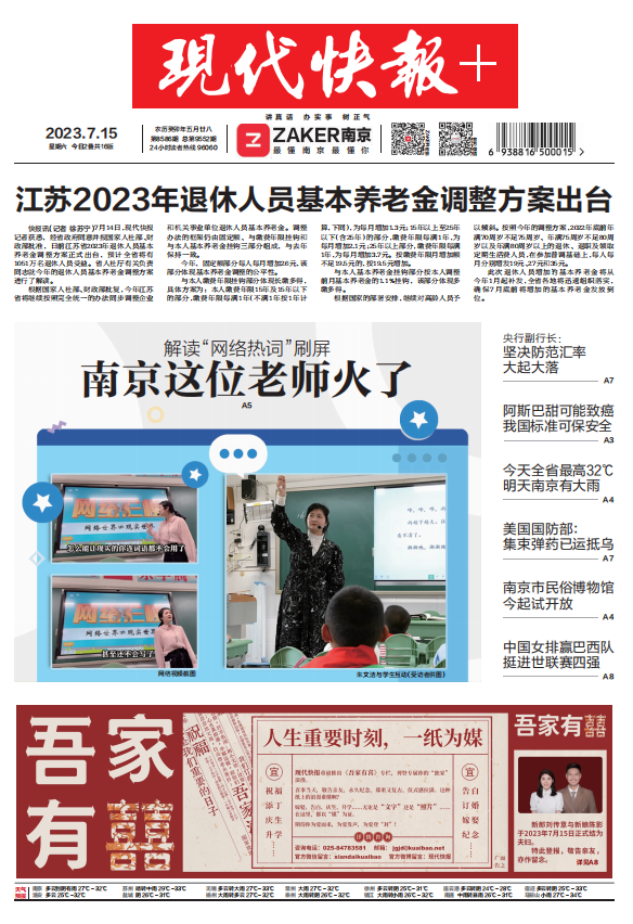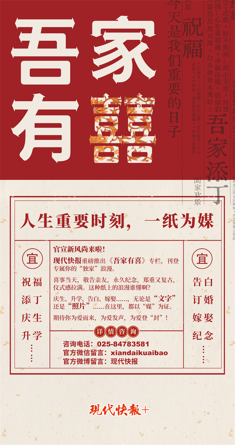 “原来结婚也能登报”这个话题最近冲上了热搜,“结婚启事”在包括《现代快报》在内的多家报纸上陆续刊登。这种仪式感满满的庆祝方式,受到不少年轻人的喜爱。7月15日,现代快报正式推出《吾家有喜》栏目,当天“1号喜报”刊出,迅速吸引了社会各界关注:“这份浪漫很复古”“字数虽然不多,但仪式感满满”“我们也想刊登”……