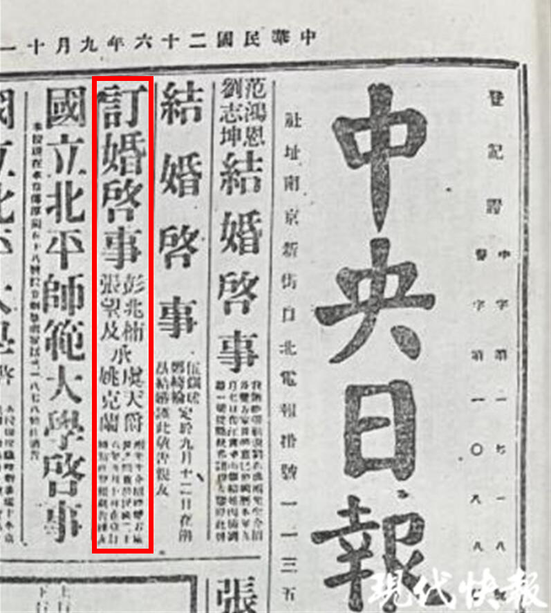 还有人觉得,重要的事情得说两遍。订婚启事也有连续刊登两遍的。1937年9月10日、11日连续两天,《中央日报》头版刊登了同一则订婚启事:“彭兆楠、张望及承虞天爵、姚克兰两先生介绍,经双方家长之同意,于民国二十六年九月十日在京订婚,特此登报,敬告亲友。”这则启事文案内容很简洁,排版上特别放大了一对新人和两位介绍人的名字,在传达喜讯的同时也表达感谢,订婚当天见报一次,第二天又见报一次。