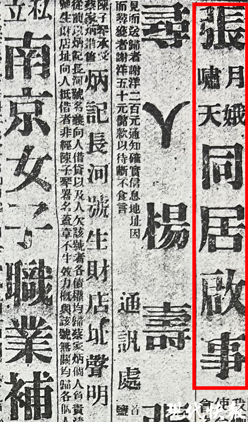 由于时代原因,当时很多年轻人得不到婚姻自由,困于包办婚姻,但他们仍然积极争取自己的幸福。在老报纸上可以看到,有年轻人为了婚姻自由而登报声明。1930年8月30日,张月娥、张啸天发了一份《同居启事》:“我俩之爱发生于数年前……虽受莫大阻碍,然我俩彻底认清目标和使命,排除一切困难,现在爱已至成熟时机,在法律亦已有根据,因之不管社会批评朋友之指摘家庭之反对,毅然同居。”
