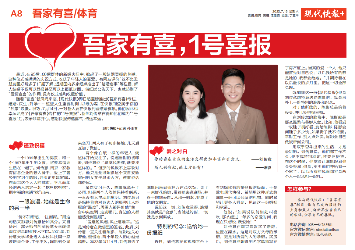 7月15日,现代快报刊登《吾家有喜,1号喜报》。封面刊登文字:“新郎刘传意与新娘陈影于2023年7月15日正式结为夫妇。特此登报,敬告亲友,亦作留念。”报纸版面除了晒结婚照、相识相恋的故事,还晒出了他们的“爱情宣言”:“你的存在让我的生活变得更加丰富和有意义。”“斯人若彩虹,遇上方知有!”
