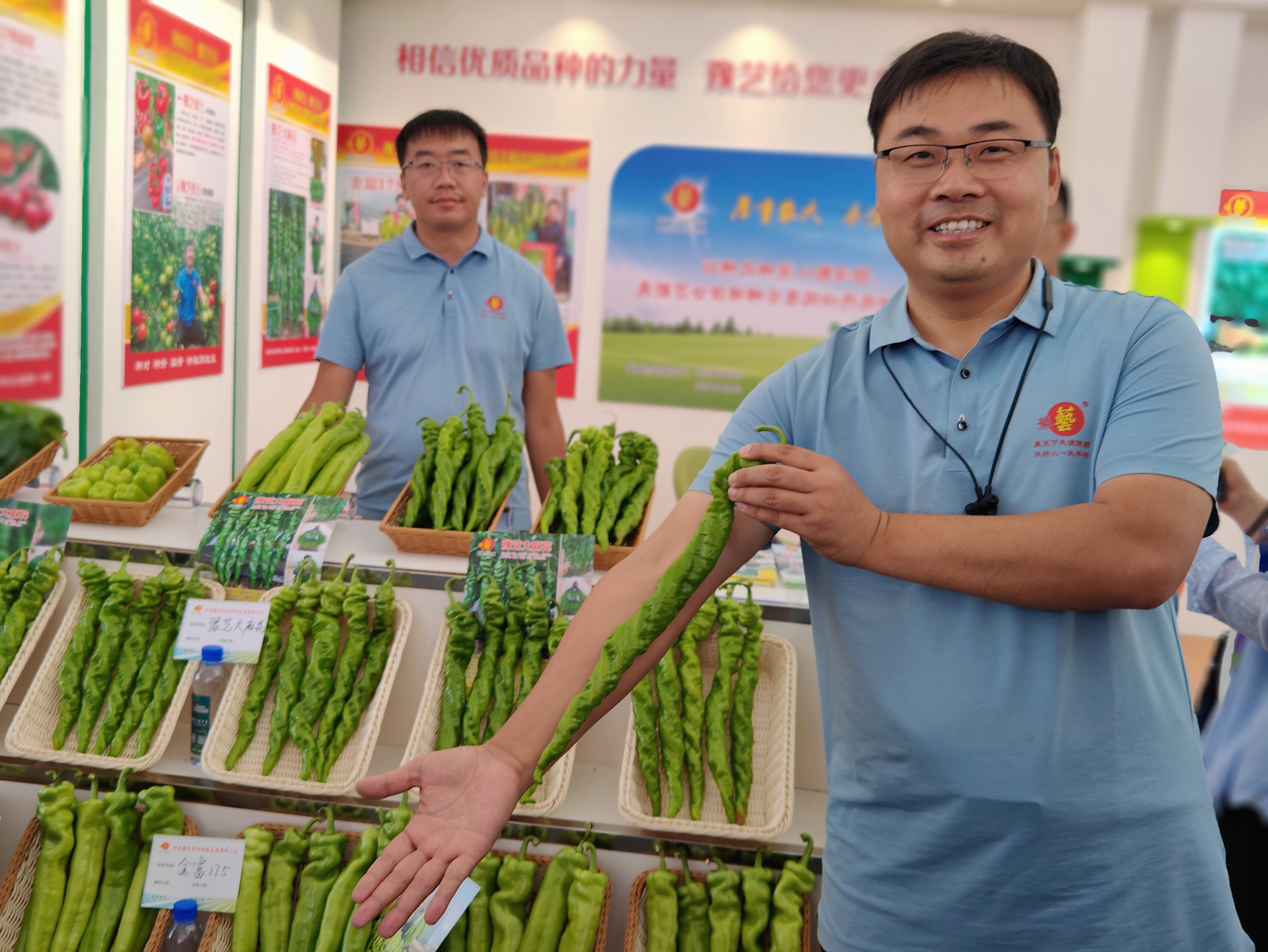 “这是我们与河南农业大学、宁夏泰金种业联合选育的全螺旋形优质螺丝椒,长度是普通辣椒的两倍,产量高,关键是皮不厚、味更香。”河南某种业科技公司总经理赵志坤感叹道,“相比其他地方,宁夏能种出更优质的蔬菜。”为此,他与种业博览会举办地保持了十几年的科研合作关系,建有科研实践基地上千亩,硕果累累。