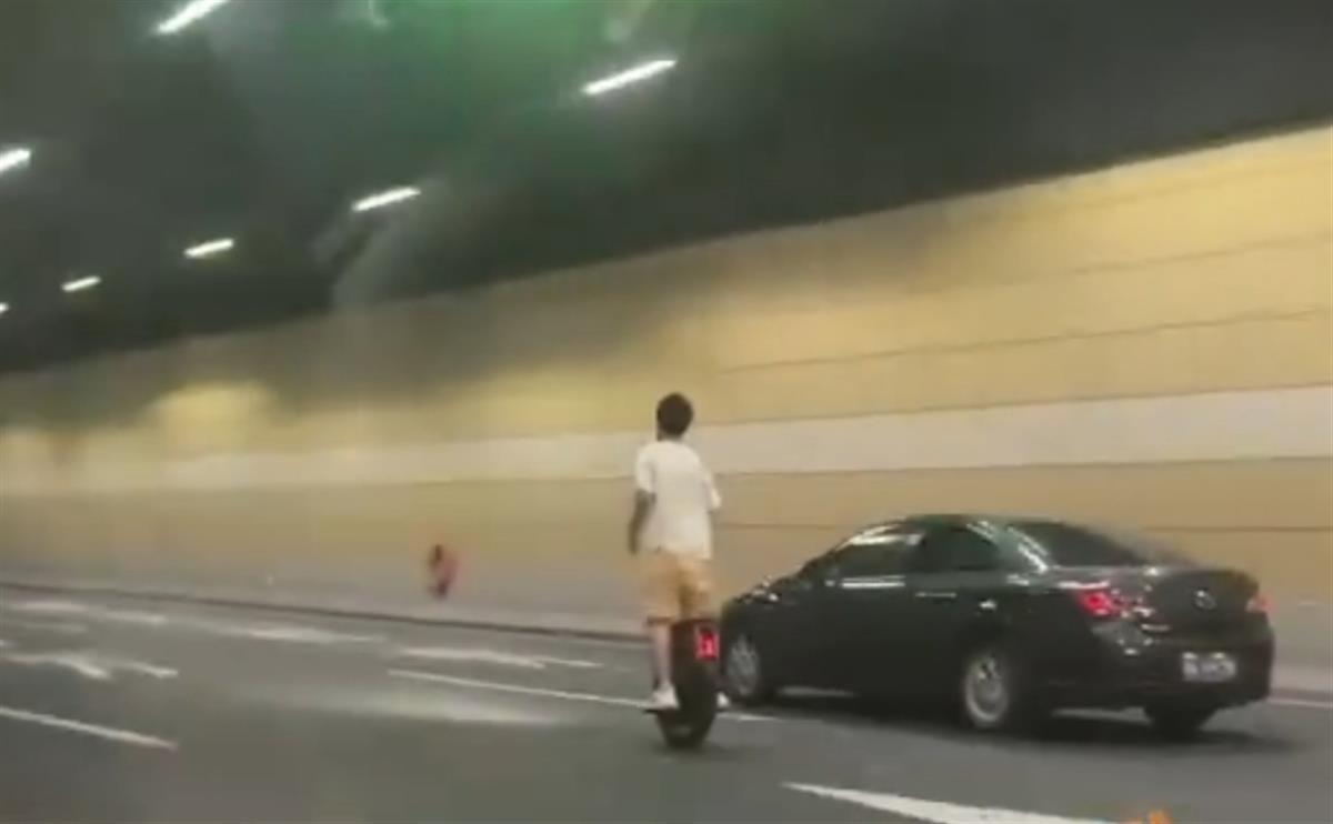 视频显示,在一条隧道内,男子骑着电动独轮车在机动车道上穿行,不但速度快,而且没有戴头盔等护具。
