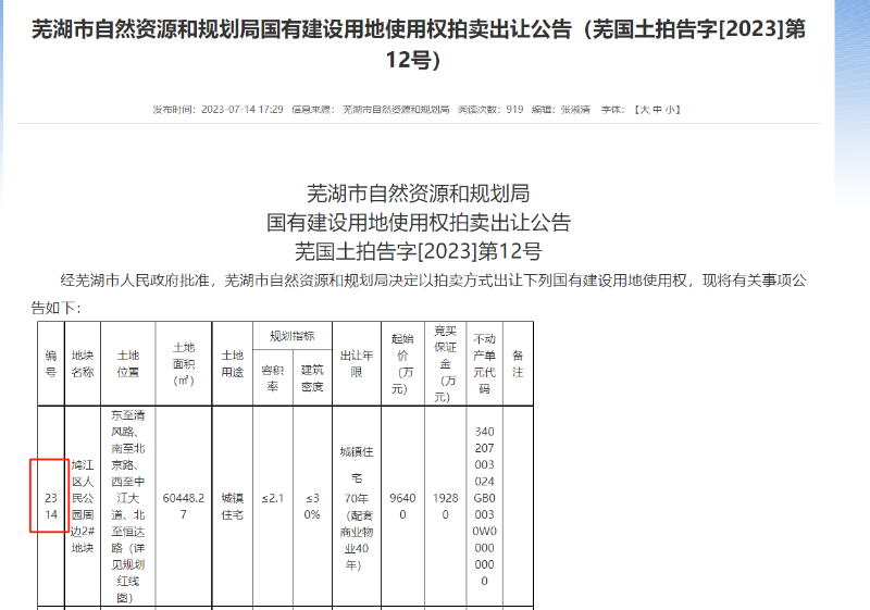 大皖新闻记者注意到,在芜湖市自然资源和规划局发布的鸠江区人民公园周边2#地块(2314号宗地)拍卖出让公告中显示,该地块起拍价为9.64亿元,起拍楼面地价为7594元/㎡。根据公告要求,2314号宗地须试点立体生态住宅。