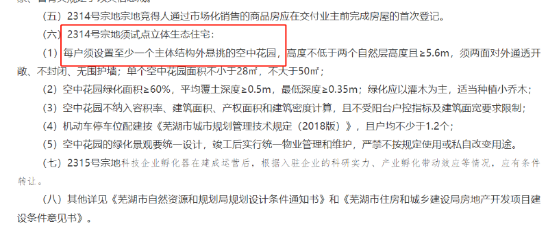 公告显示,2314号宗地建设的商品房每户须设置至少一个主体结构外悬挑的空中花园,高度不低于两个自然层高度且≥5.6m,须两面对外通透开敞、不封闭、无围护墙;单个空中花园面积不小于28㎡,不大于50㎡;空中花园绿化面积≥60%,平均覆土深度≥0.5m,最低深度≥0.35m;绿化应以灌木为主,适当种植小乔木。