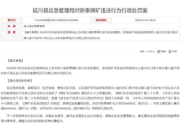 据上游新闻,延川县新泰煤矿(普通合伙)成立于2008年5月6日。另据潮新闻,该煤矿曾多次因涉嫌违反相关行政法规被处罚。2022年4月11日,延川县应急管理局以特种作业人员未经专门的安全培训并取得操作资格证书,上岗作业;未按照规定对从业人员、被派遣劳动者、实习学生进行安全生产教育和培训,或者培训不合格,或者未按照规定如实告知有关的安全生产事项,就安排上岗作业的;设备、设施未定期检查维修,或做好记录等原因,对新泰煤矿罚款16万元。2023年4月27日,延川县应急管理局发布对新泰煤矿违法行为行政处罚案结果,认定新泰煤矿存在监控系统显示人数与井口电子显示牌人数不同步和个别从业人员安全教育培训不合格上岗作业的行为。决定对新泰煤矿处人民币80000元(捌万元),对其主要负责人夏洪满处8000元(捌仟元)罚款。合并处罚人民币88000元(捌万捌仟元)罚款的行政处罚。