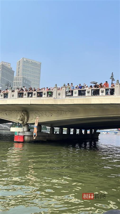 还没等众人反应过来,一位穿着黑裤衩、左肩贴着蓝色膏药布的大爷爬上护栏,大喊一声“起飞吧”,纵身一跃跳进了水里。桥上跳水的人络绎不绝,桥面和桥下围满了观众,还有人主动当起了“裁判”。