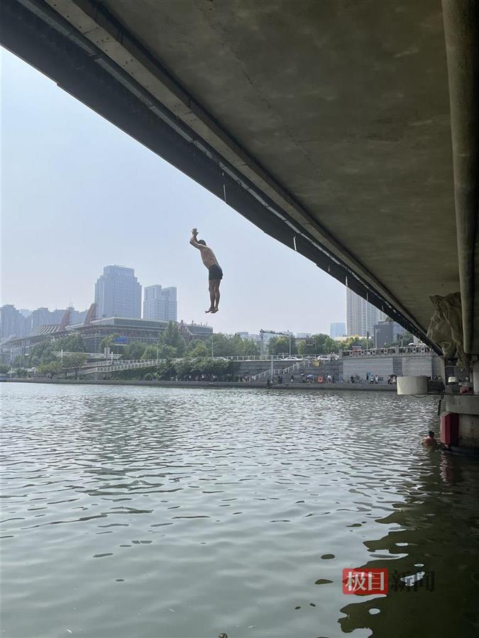 除了围观,也有不少人加入了跳水队伍。记者在现场看到,跳水的人员里,年轻人占了一大半。20岁的郭维鹏站上桥檐,将两只拖鞋丢进了水里,又低头看了看水面,他不自觉往后退了一步。人群中开始有人起哄,也有人大喊,“别跳啦,别跳啦!”