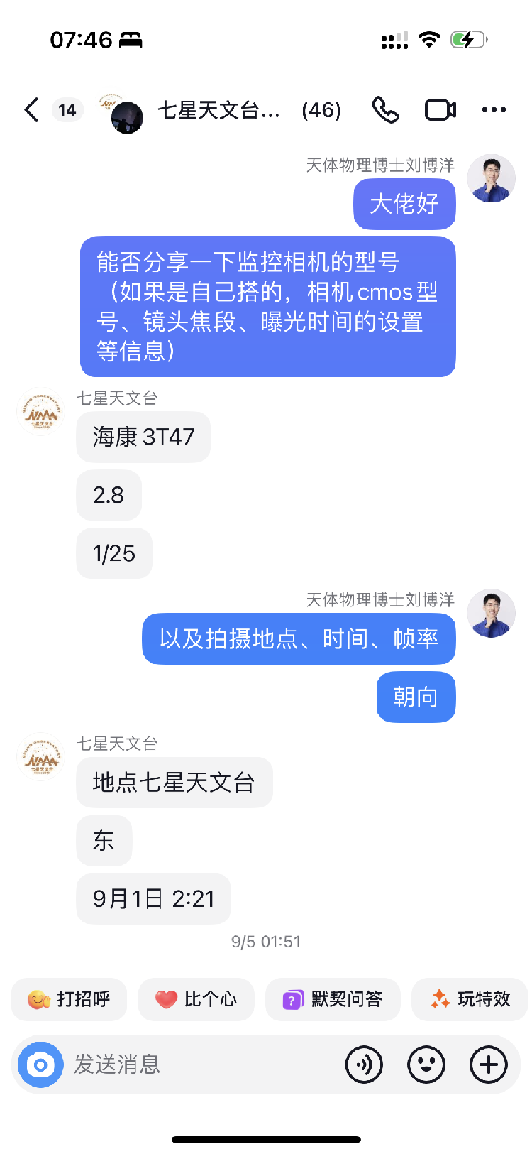 刘博洋向七星天文台工作人员咨询了其拍摄所用摄像头型号、镜头焦段、曝光时间等相关问题,得到回复摄像头型号为“海康3T47”。