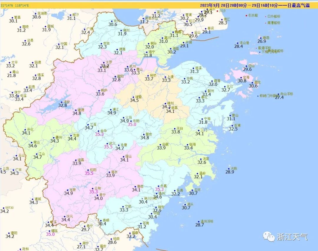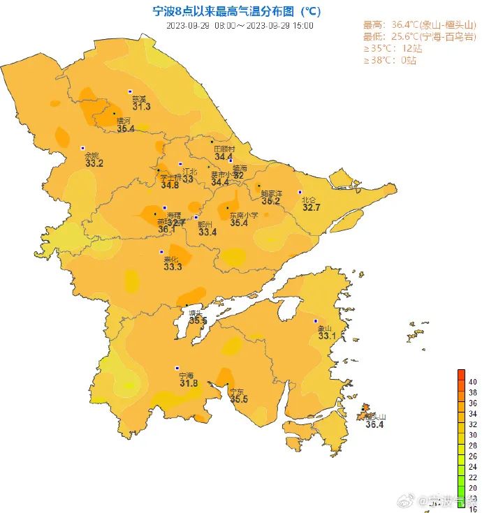 冷空气锋前增温的威力真不是盖的,昨天宁波市区最高气温33.4℃,有12个自动站超过了35℃,全市最高气温代表站为鄞州站33.4℃;全市(含区域站)最高气温为象山檀头山站36.4℃,其次为海曙燕玲小学站36.1℃。