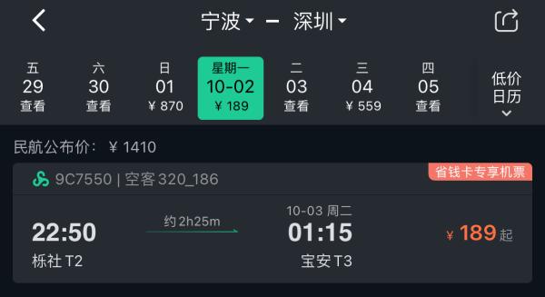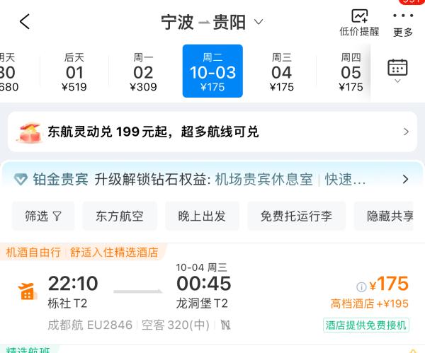 9月30日一早,记者通过各航司官网和旅游OTA平台查了下未来几天宁波出发飞国内各目的地的机票价格,虽没有看到网上说机票价格大幅“跳水”的情况,但中秋国庆假期期间机票价格之低也确实让人有些意外——10月2日,宁波飞深圳189元,飞西安370元;10月3日,宁波飞贵阳175元,飞长沙289元,飞成都320元,飞武汉340元;10月4日,宁波飞西双版纳297元,飞重庆440元……就连飞三亚、乌鲁木齐等传统热门航线的机票价格也与平日相差无几。