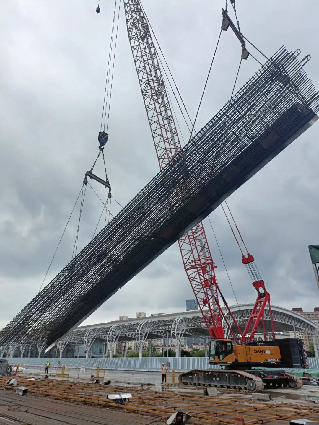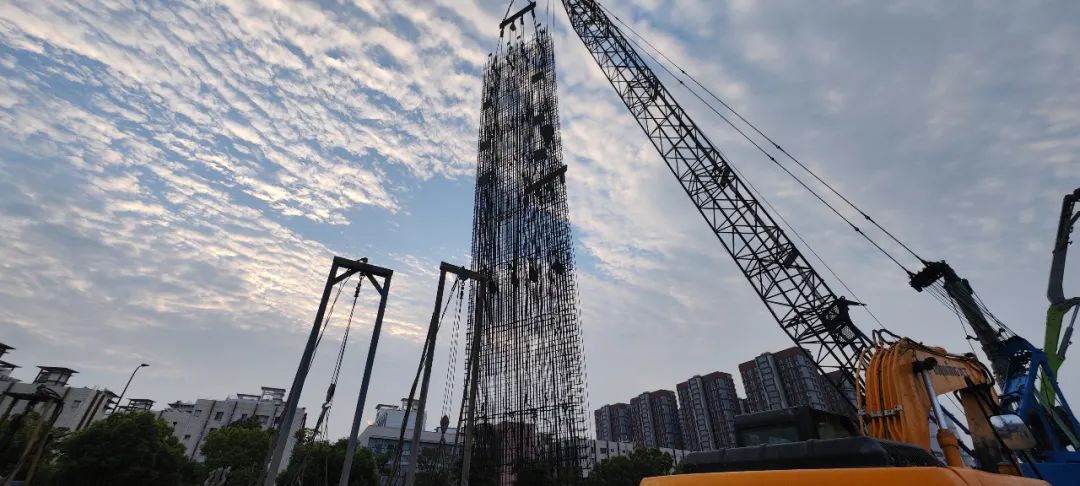 23号线沪金高速站,施工人员正在进行地下连续墙钢筋笼吊装作业