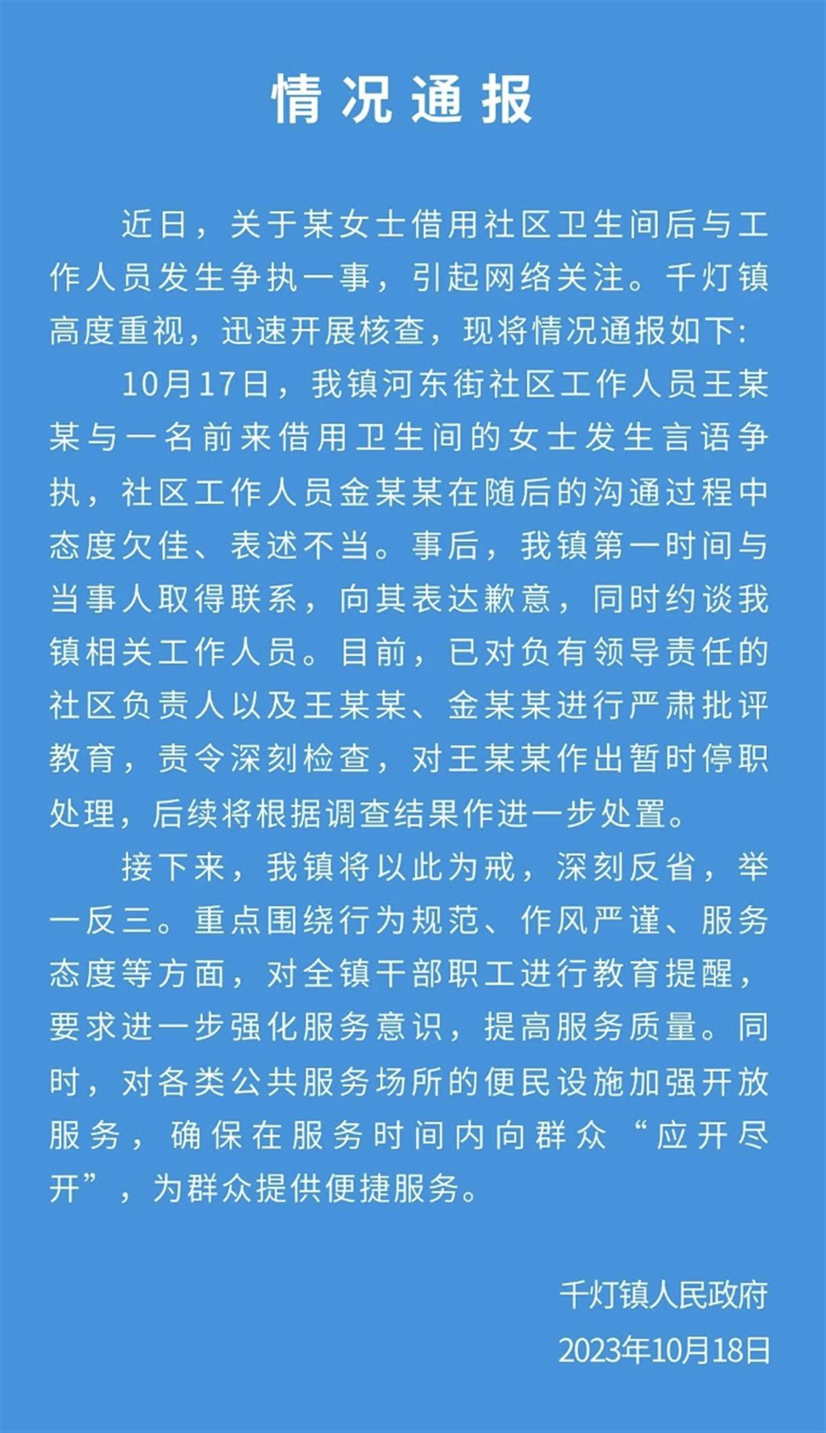 18日晚,千灯镇人民政府对外发布通报称,10月17日,该镇河东街社区工作人员王某某与一名前来借用卫生间的女士发生言语争执,社区工作人员金某某在随后的沟通过程中态度欠佳、表述不当。事后,该镇第一时间与当事人取得联系,向其表达歉意,同时约谈该镇相关工作人员。目前,已对负有领导责任的社区负责人以及王某某、金某某进行严肃批评教育,责令深刻检查,对王某某作出暂时停职处理,后续将根据调查结果作进一步处置。同时,对各类公共服务场所的便民设施加强开放服务,确保在服务时间内向群众“应开尽开”,为群众提供便捷服务。