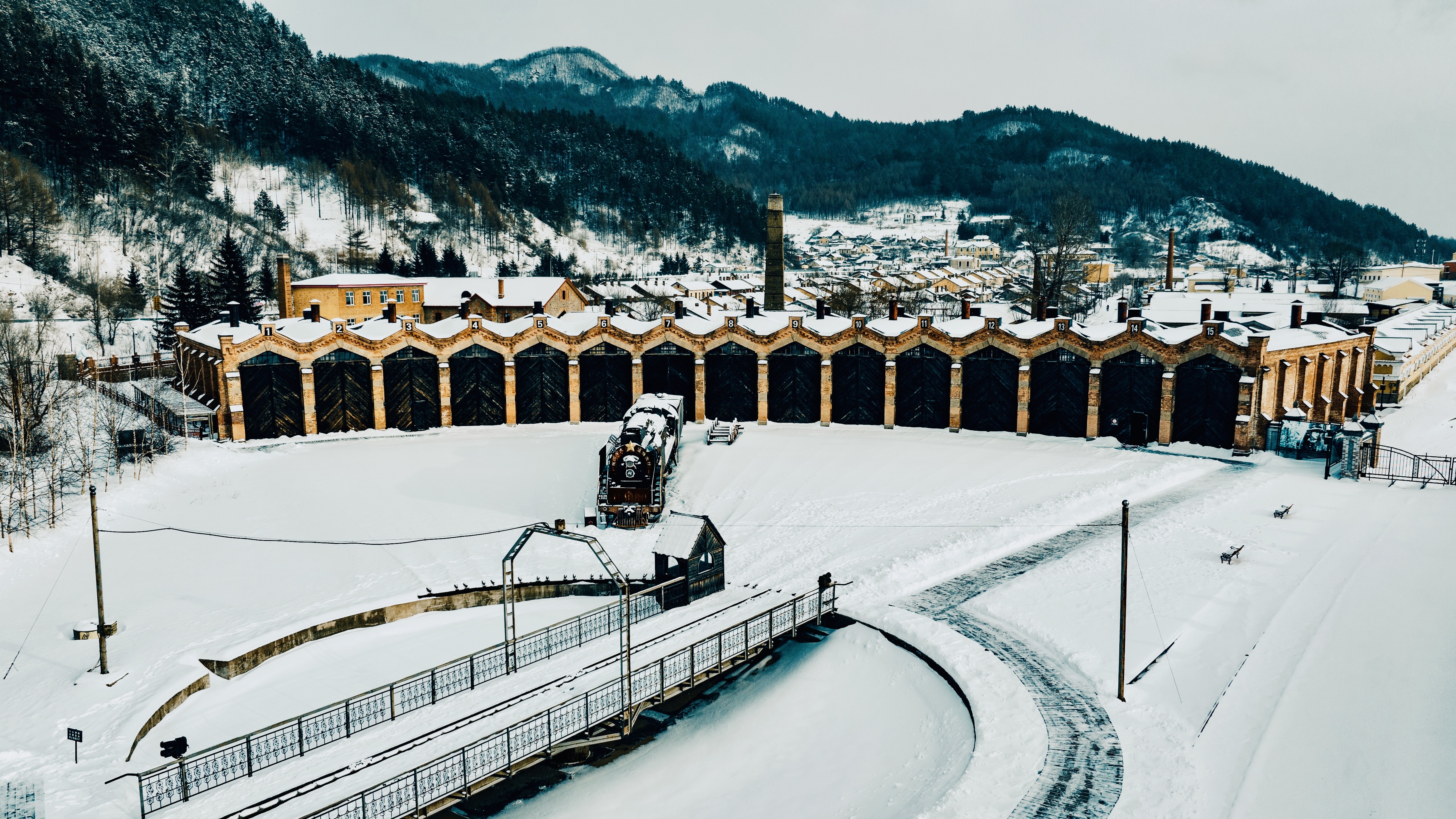 这是海林市横道河子镇中东铁路博物馆机车库展区(无人机照片,11月24日摄)。新华社发(范峻辰摄)