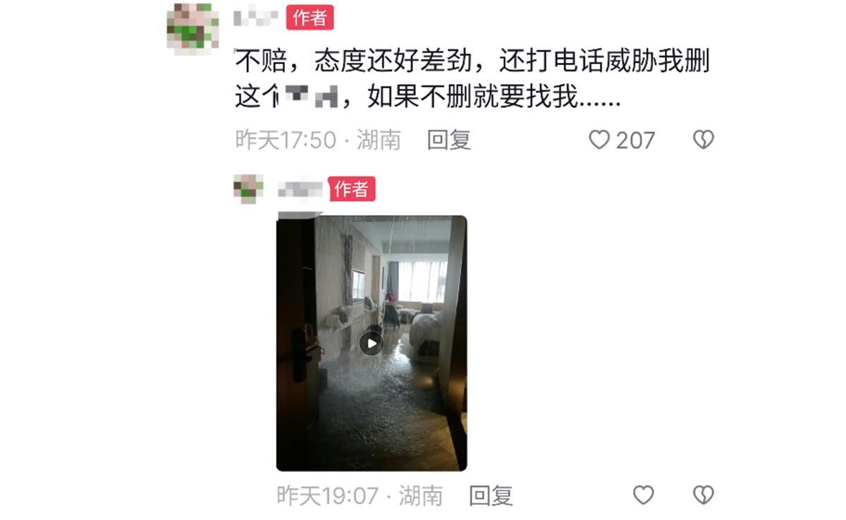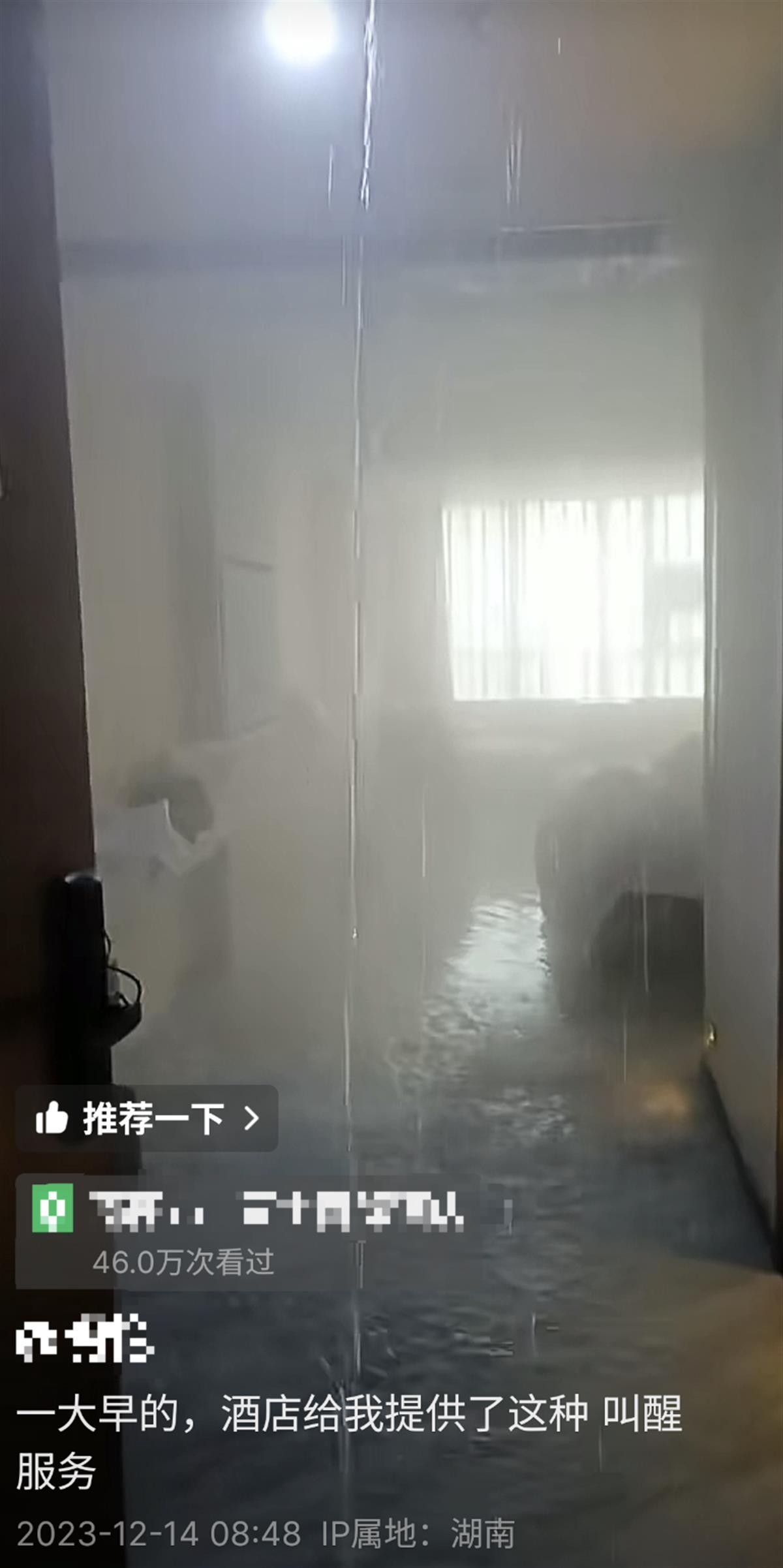 12月14日上午,当事女顾客在网上发布了上述视频,称这是她在湖南省邵东市一酒店遭遇的场景。她在视频留言区回复网友称,自己一个人居住并未吸烟,是酒店空调位置漏水,一早上自己在睡梦中被吓醒。但此事店方处理态度不好,还给她打电话要求删除网上的视频,目前,她已经报警并向有关部门投诉。