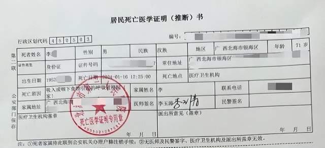北海市第二人民医院出具的《死亡记录》显示,2024年1月16日,患者仍未清醒、无自主呼吸、刺激无反应,家属放弃一切治疗及抢救,拔除气管插管、停药,患者于当日12时25分死亡。死亡原因为吸入或咽下食物引起的呼吸道梗阻、缺氧缺血性脑病。