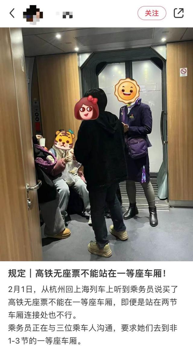 近日有网友发帖称,杭州回上海的高铁上,有乘务员劝阻无座票旅客离开一等座车厢,即使是站在两节车厢的连接处也不行。