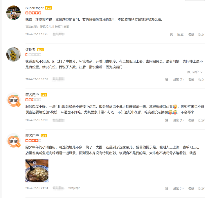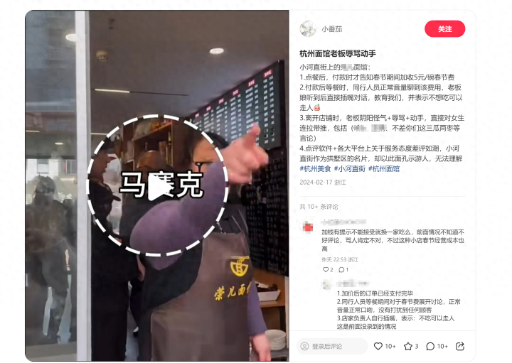 小陈把这不愉快的遭遇发在了小红书上。她向潮新闻记者表达了疑问:春节期间的服务费是否合理?涨价的幅度是否有相关部门监管?多少范围是合理可行的?她表示,店家的态度自己不认可,主要是不满意老板娘对她们进行说教。