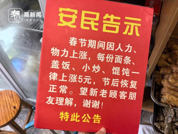 今天上午,潮新闻记者来到这家面馆了解情况。小陈所说的光头男子,姓贺,是店内的老板。记者告诉了贺先生来意,贺先生表示,过年期间需要加收服务费,因为春节期间人力和物力成本上涨,过完春节就没有了。今年年初一开门营业的时候,就在店内贴上了涨价告示。今天年初九了,店内的涨价告示也拿下来了。