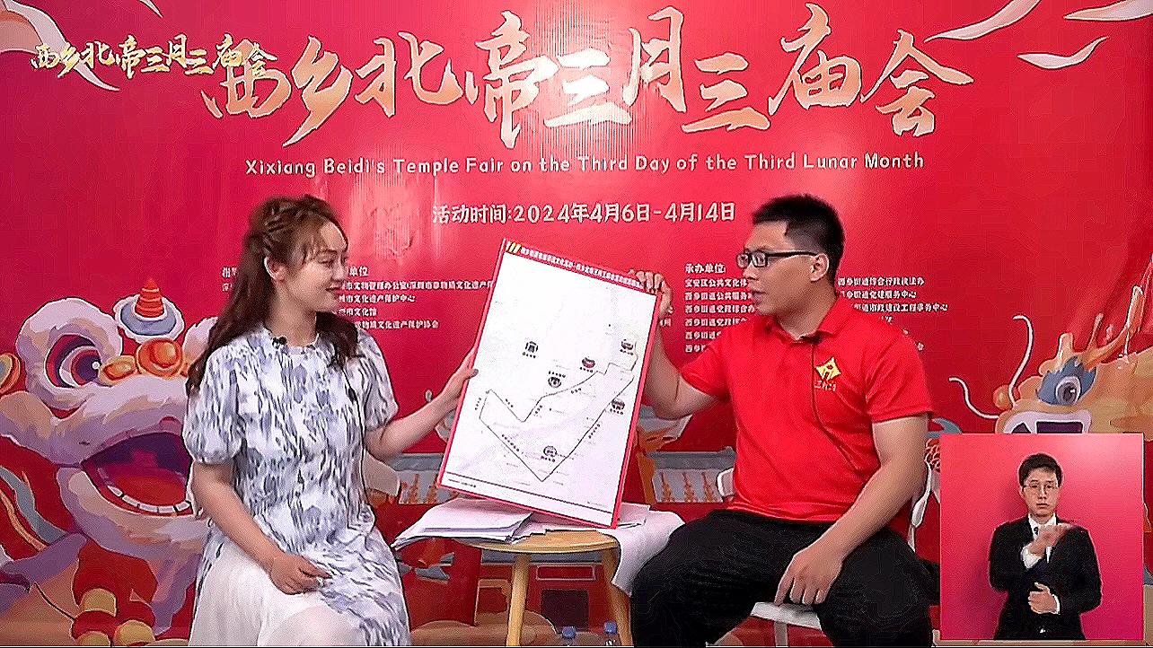 深圳新闻网2024年4月12日讯(记者 温幸欣)4月6日,省级非遗——西乡北帝三月三庙会活动正式启幕,当天下午,万人瞩目的大巡游开始,由深圳新闻网主持团领衔的现场直播间也火热进行,先后有上千万人涌入直播间。有细心的人发现,在今年直播屏幕的右下角,有一位手语播报老师也正在同步地以手语的方式传递着活动的精彩时刻。对此,有不少网民对此表示惊喜和感动,纷纷为庙会点赞——“太贴心了,还准备了手语老师!”“这下好了,听障朋友也能一起感受活动的热闹氛围了!”