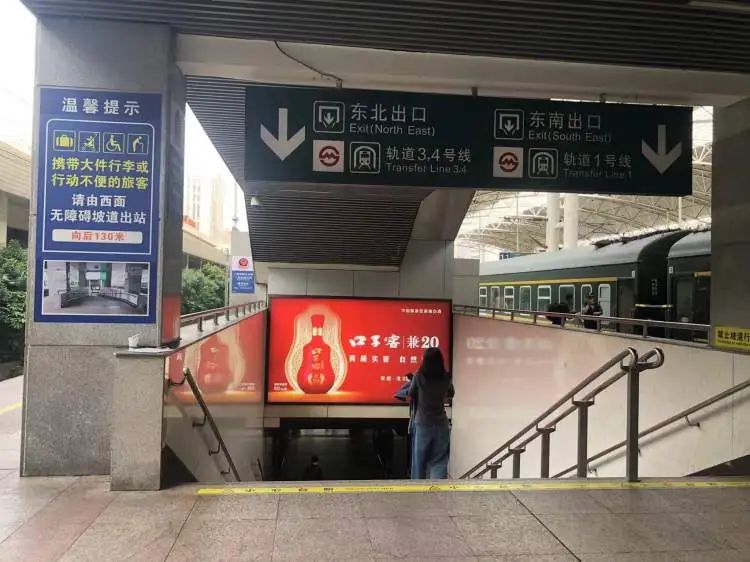 在火车站站台的柱子上,非常醒目地张贴了标识,告诉旅客西北、西南出口是无障碍通道,向前多少米,并且,下方还有一张无障碍通道大斜坡的照片。同时,这个标识还告诉旅客,换乘地铁三、四号线走西北出口,换乘地铁一号线走西南出口。