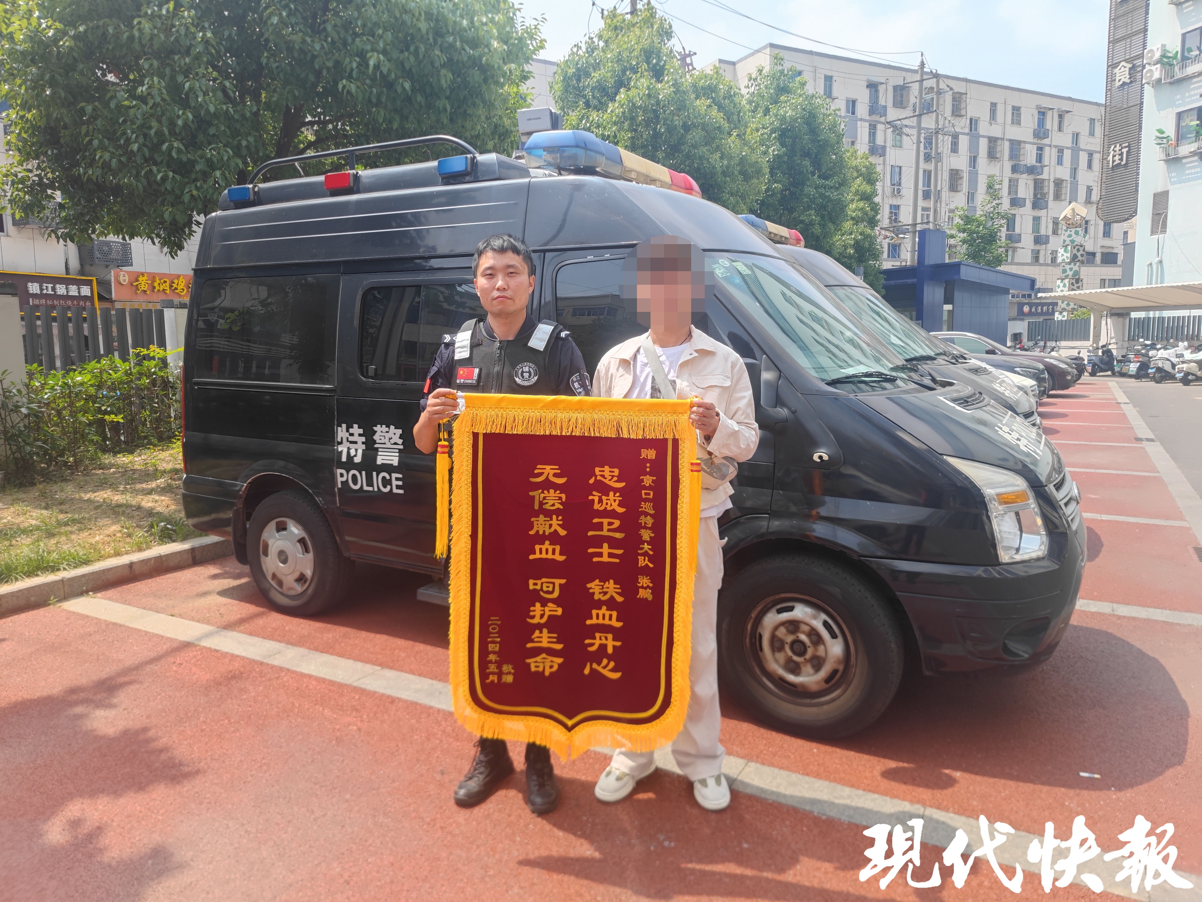 5月24日,家住苏州的乔先生专程赶来镇江,为镇江市公安局京口分局巡特警大队辅警张鹏送上印有“忠诚卫士铁血丹心无偿献血呵护生命”的锦旗,感谢他及时送来救命血。