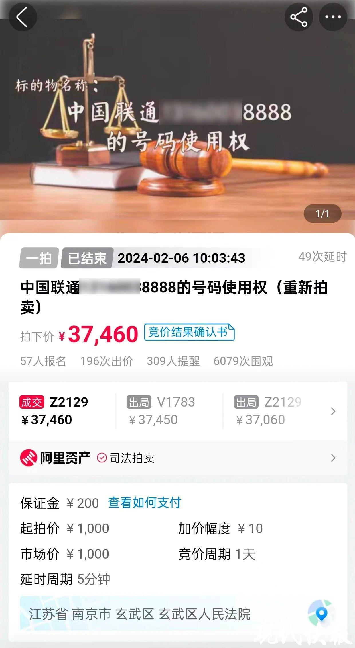 △小张以37460元的价格竞得尾号为8888的靓号