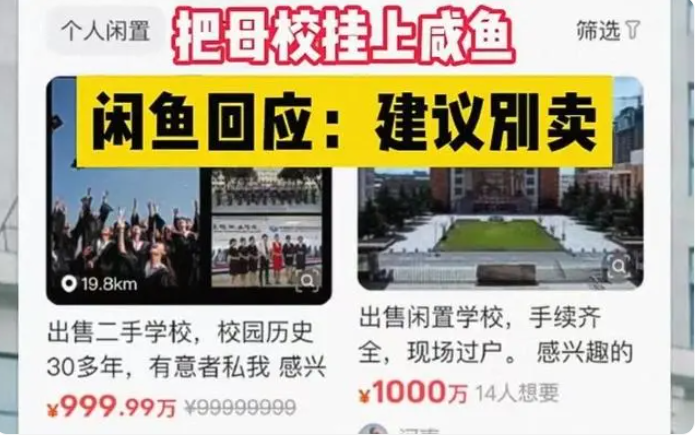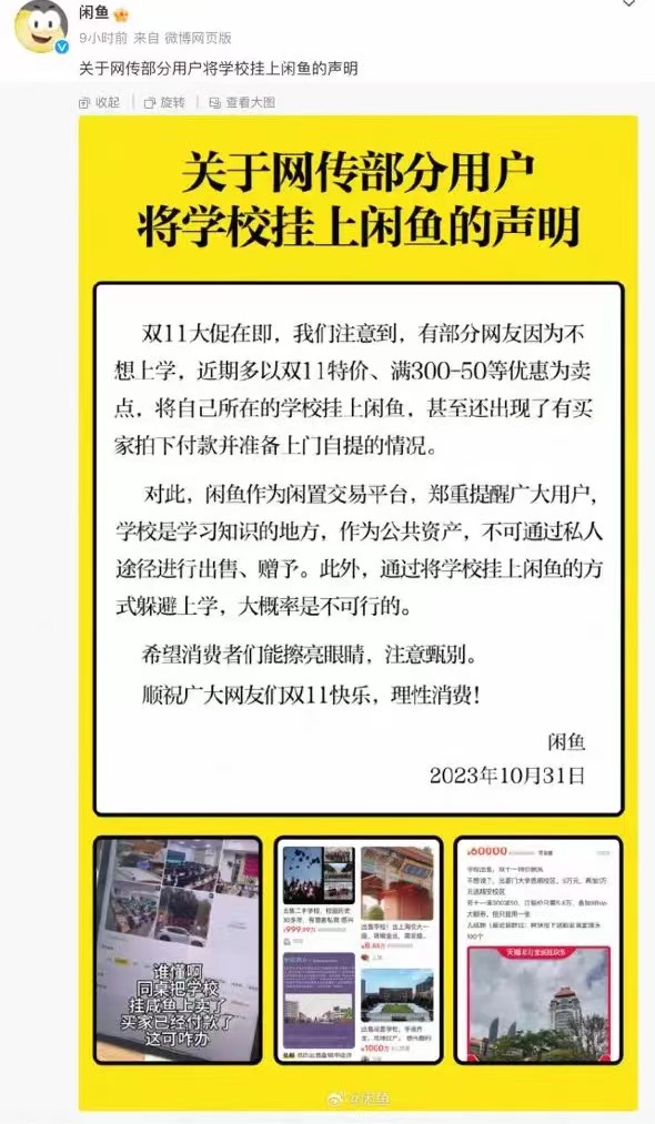 在此之前,就有过相似的例子,2023年有大学生在闲鱼平台低价卖母校,闲鱼官方也曾做出回应。