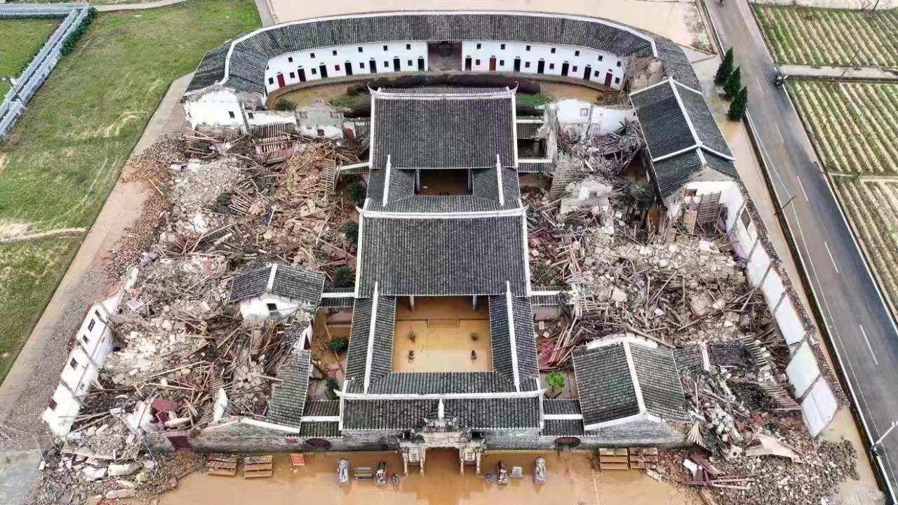一座位于龙岩市上杭县稔田镇官田村的老建筑在此次降水中受损严重。
