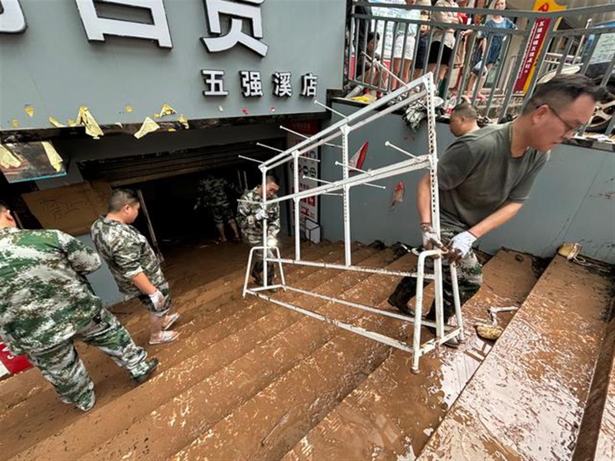 6月23日,在湖南省沅陵县五强溪镇,当地政府组织力量帮助沿街商铺搬运被洪水浸泡的物品(图片来源:新华社)