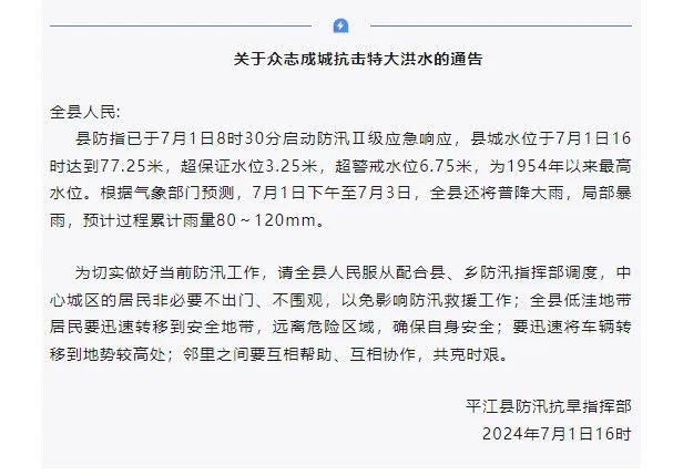 7月1日下午,平江县防汛抗旱指挥部发布《关于众志成城抗击特大洪水的通告》称,7月1日下午至7月3日,平江县还将普降大雨,局部暴雨,预计过程累计雨量80~120mm。