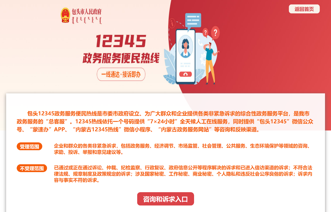 据了解,包头12345政务服务便民热线是为广大群众和企业提供各类非紧急诉求的综合性政务服务平台,是全市政务服务的“总客服”。12345热线依托一个号码提供“7×24小时”全天候人工在线服务,同时提供“包头12345”微信公众号、“蒙速办”APP、“内蒙古12345热线”微信小程序、“内蒙古政务服务网站”等咨询和反映渠道。