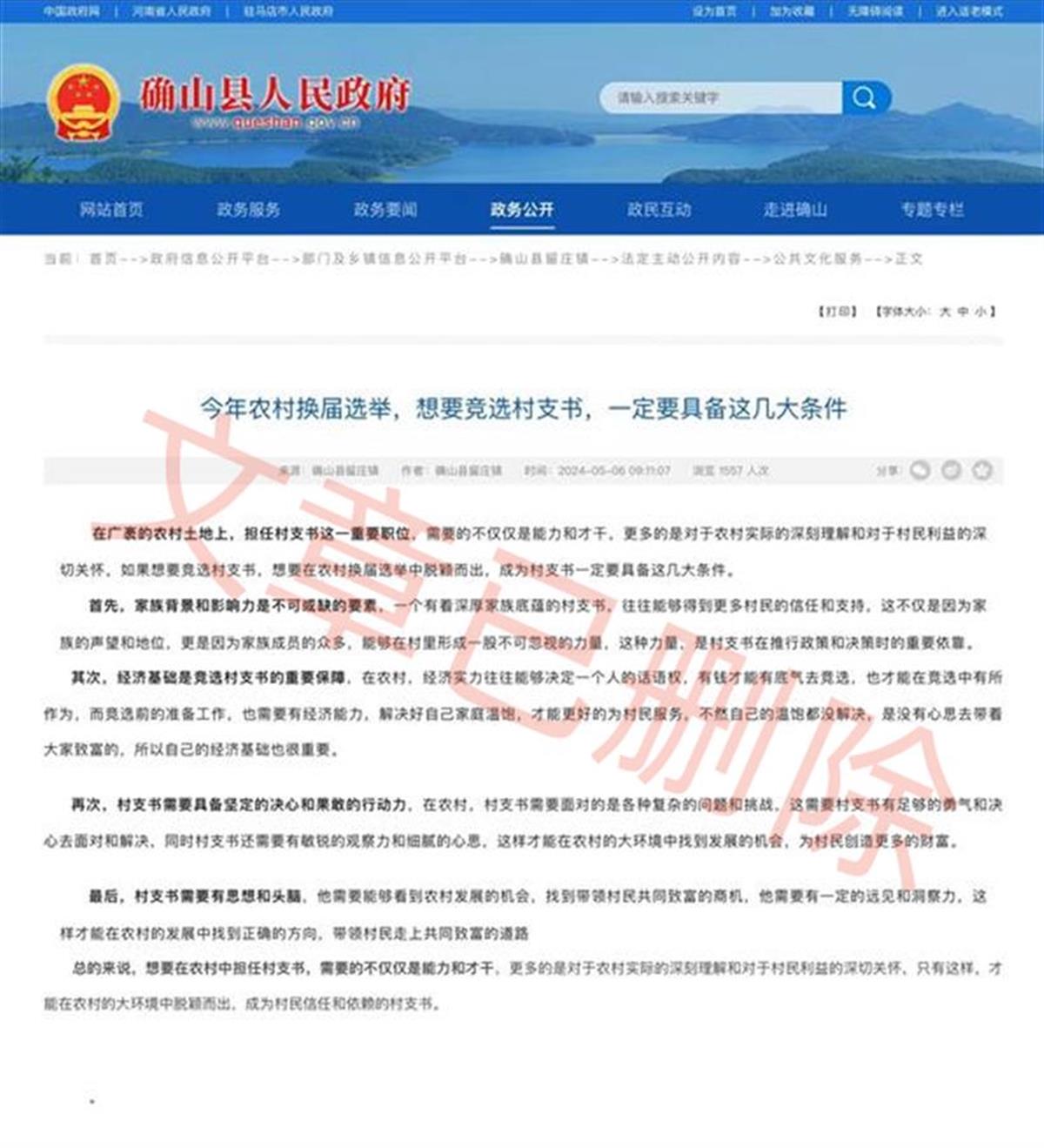 近日,河南驻马店市确山县政府官网上一篇《今年农村换届选举,想要竞选村支书,一定要具备这几大条件》一文引发关注和热议。该文来源为确山县留庄镇。文章称,想要竞选村支书,一定要具备几大条件。首先要有家族背景和影响力;其次,经济基础是竞选村支书的重要保障,在农村,有钱才能有底气去竞选,也能在竞选中有所作为。