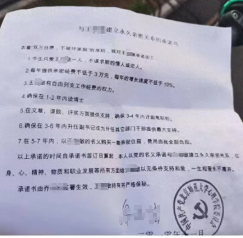 网传北京师范大学食堂门口的共享单车上出现一张《与王某某建立永久亲密关系承诺书》,落款为乔某某的手写签名,并盖有北京师范大学心理学院委员会公章。