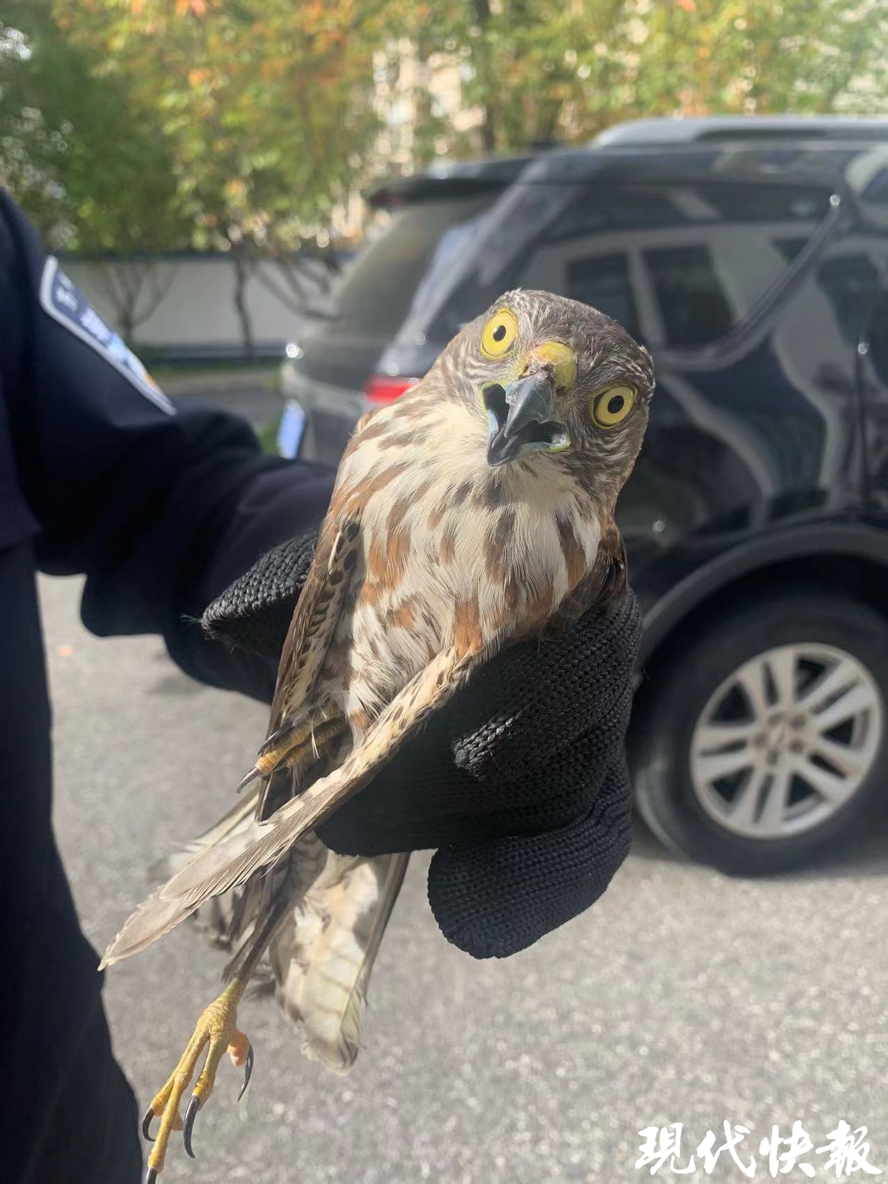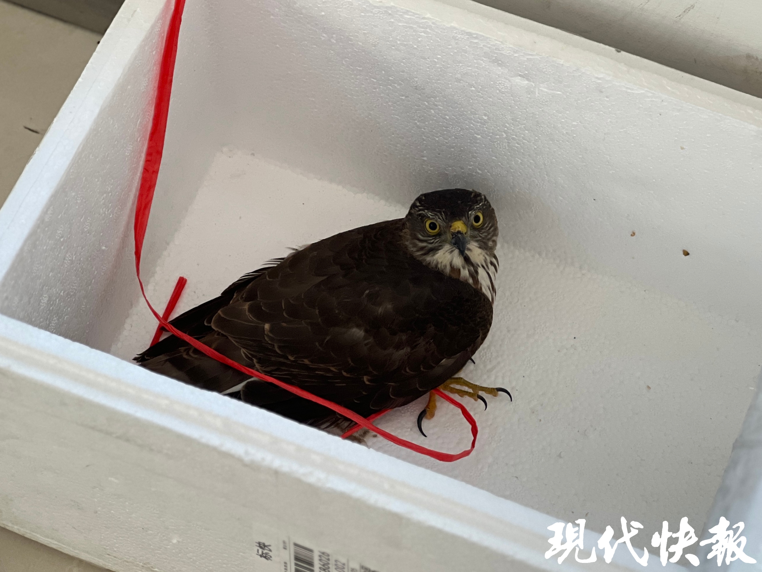 现代快报记者了解到,在进行细致检查后,工作人员发现这只松雀鹰并无明显外伤,需要接回林业部门进一步训练,待其具备野外生存能力后再放归大自然。