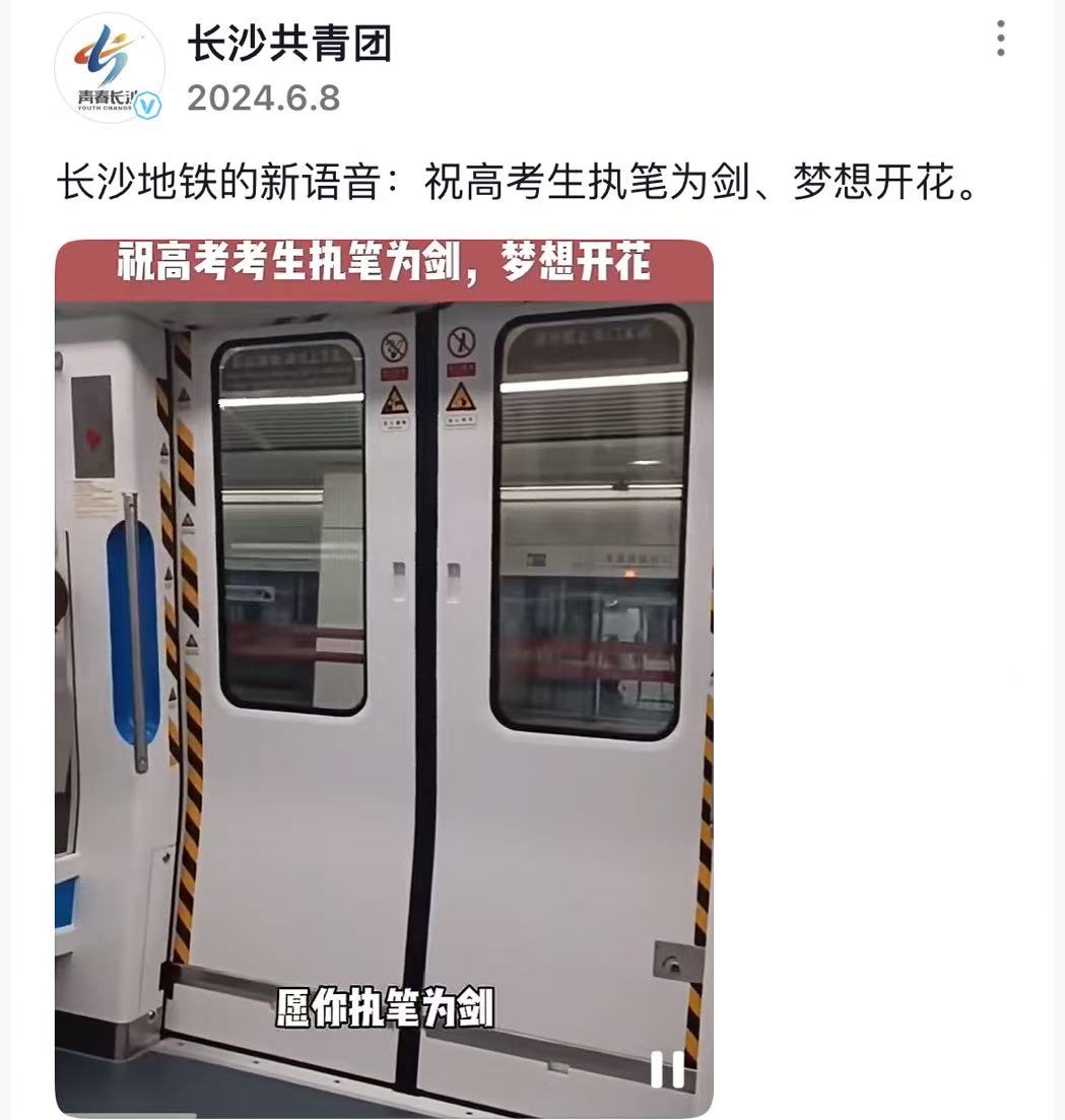 在每个重要的时间节点,长沙人都收到过长沙地铁独特的“报站祝福”。今年的高考季,长沙地铁就寄语广大考生:愿您执笔为剑,梦想开花。