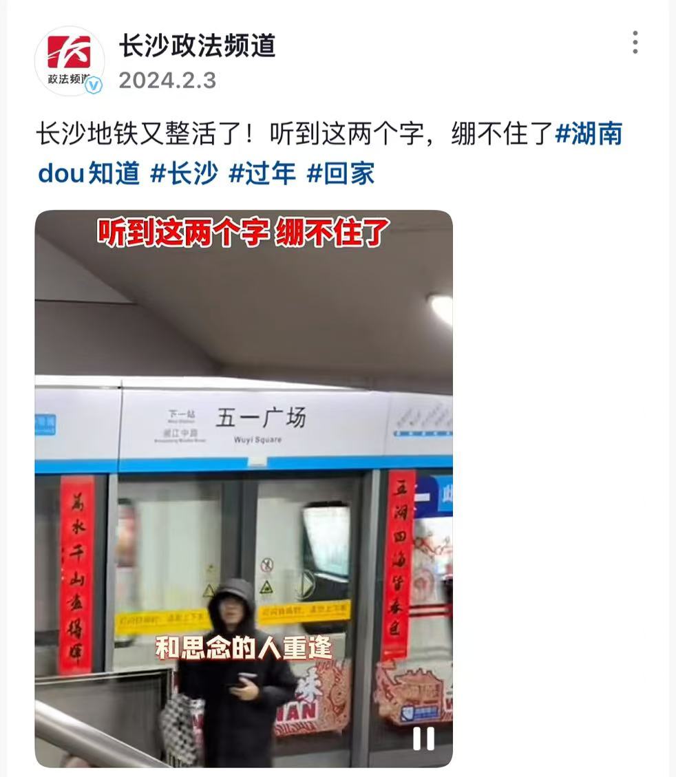 春节前,长沙地铁会暖心的对乘客说:快过年了,团圆的列车即将发车。下一站,回家。和思念的人重逢,给身心放个假,龙年我们再出发。