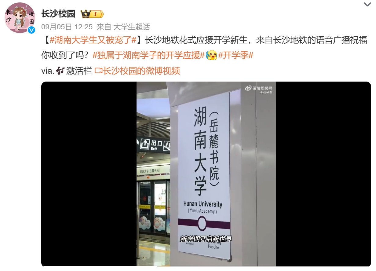 9月开学季,长沙地铁上线新播报语音,花式应援各大高校新生:又是一年开学季,新学期开启新世界,梦想就在前方,长沙地铁愿你不负韶华,勇敢前行。