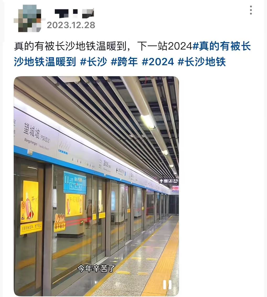 2023年12月28日,乘坐长沙地铁的乘客当时都听到了一句特殊的广播报站:2023即将到站,对过去的自己说一声再见,今年辛苦了!下一站2024,愿我们不慌不忙、闪闪发光!