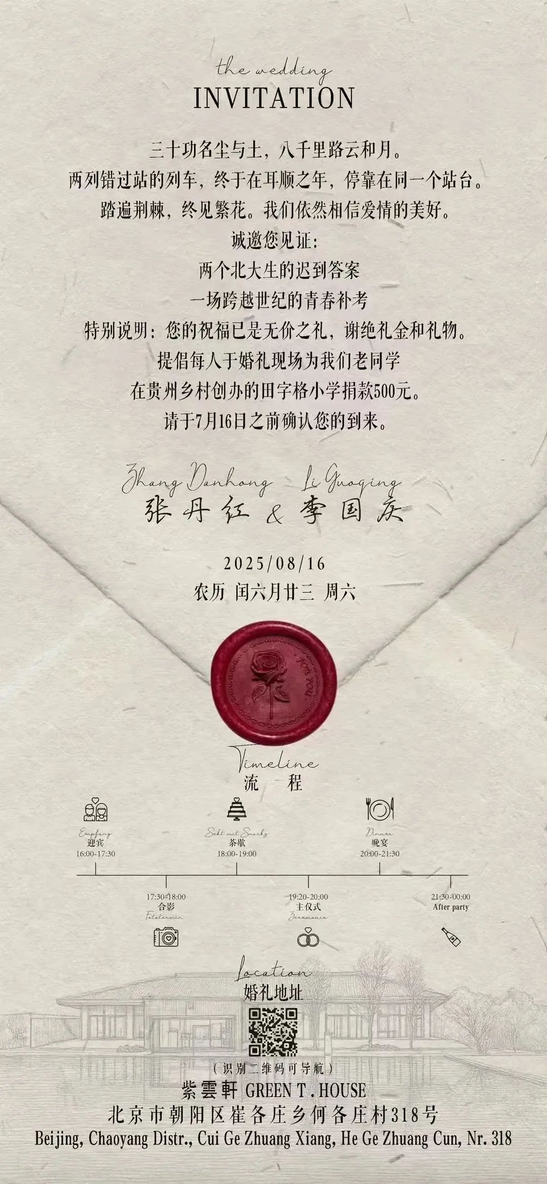 三十功名尘与土,八千里路云和月。两列错过站的列车,终于在耳顺之年,停靠在同一个站台踏遍荆棘,终见繁花。我们依然相信爱情的美好。诚邀您见证:两个北大生的迟到答案场跨越世纪的青春补考特别说明:您的祝福已是无价之礼,谢绝礼金和礼物。提倡每人于婚礼现场为我们老同学在贵州乡村创办的田字格小学捐款500元。请于7月16日之前确认您的到来。