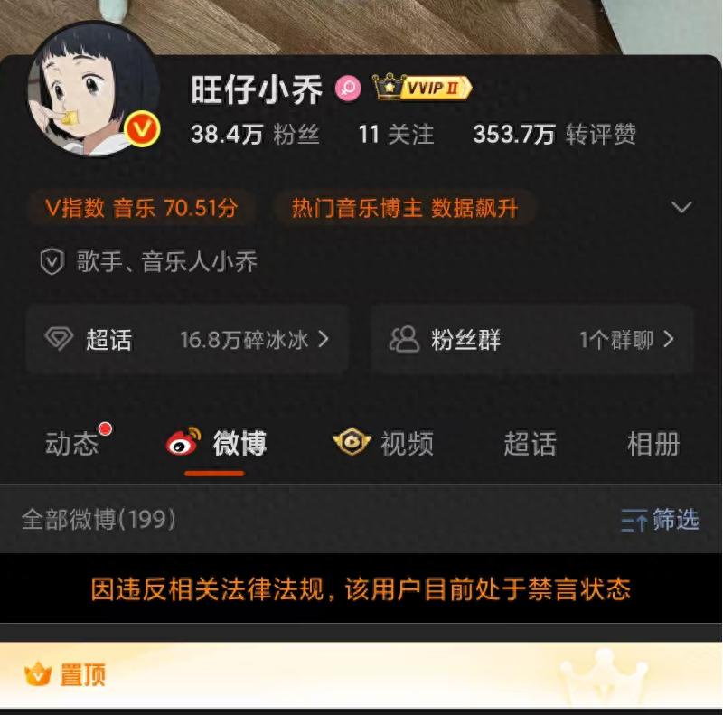 网红“旺仔小乔”微博被禁言,抖音已掉粉超430万;其蒙面演唱会已延期,公开道歉信被指查重率达97%