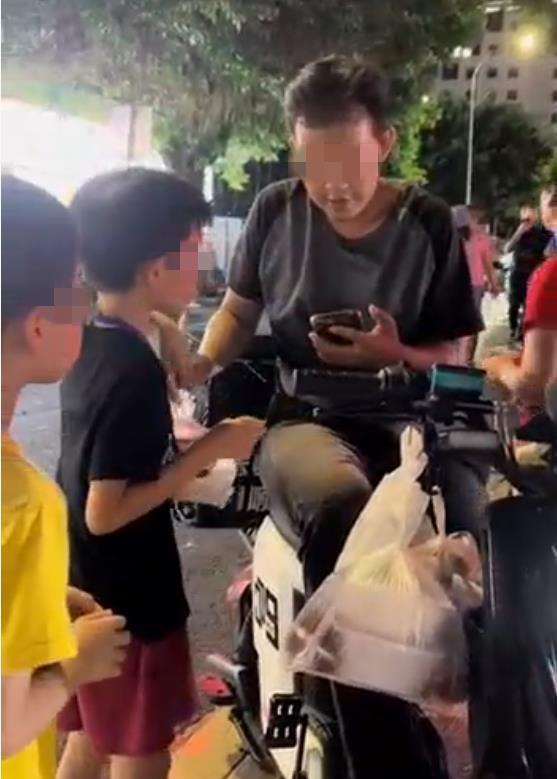 一名外卖员正将餐食交给代送的小孩 (视频截图)
