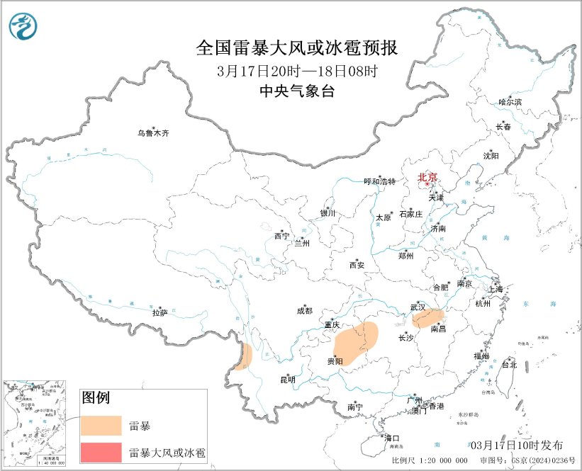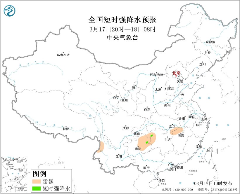 预计3月17日14时至18日08时,湖南西北部、江西北部、四川南部、重庆东南部、贵州中部和东部、云南西部和南部等地的局地将有雷暴;另外,湖南西北部、贵州东部等地的局地将有短时强降水天气,小时雨量20-30毫米。