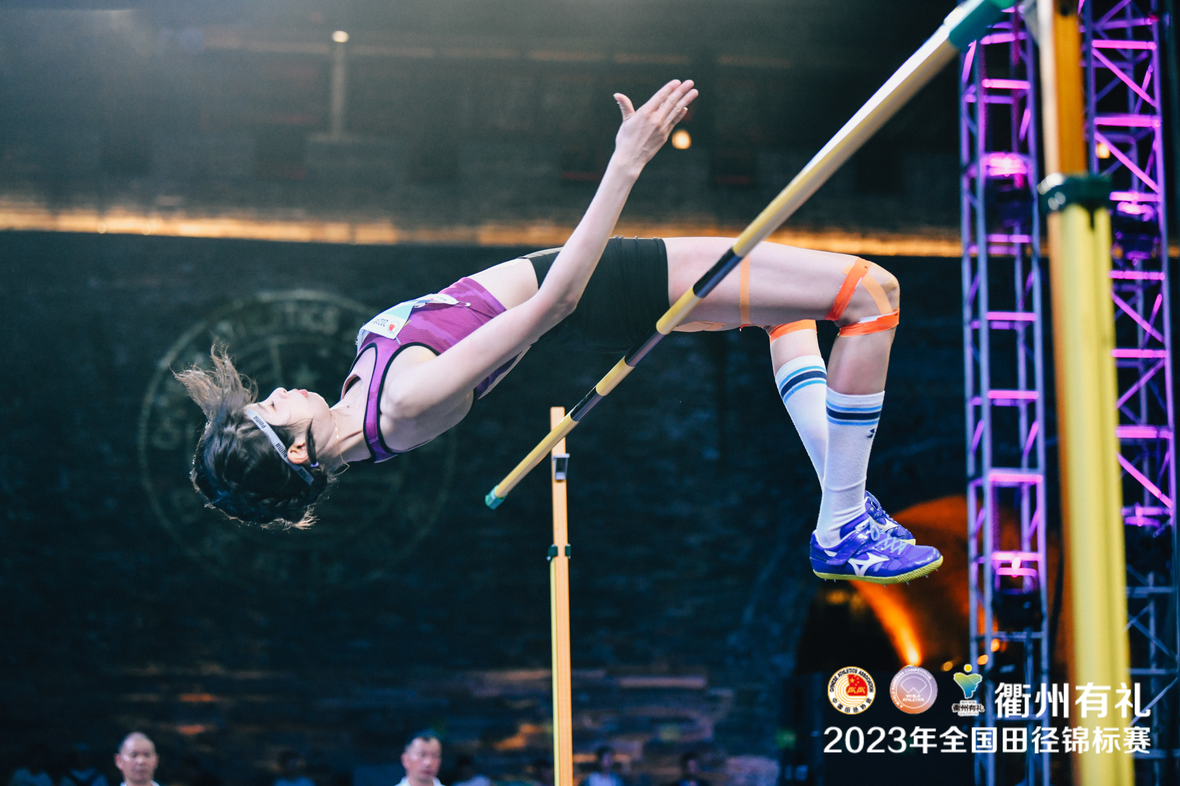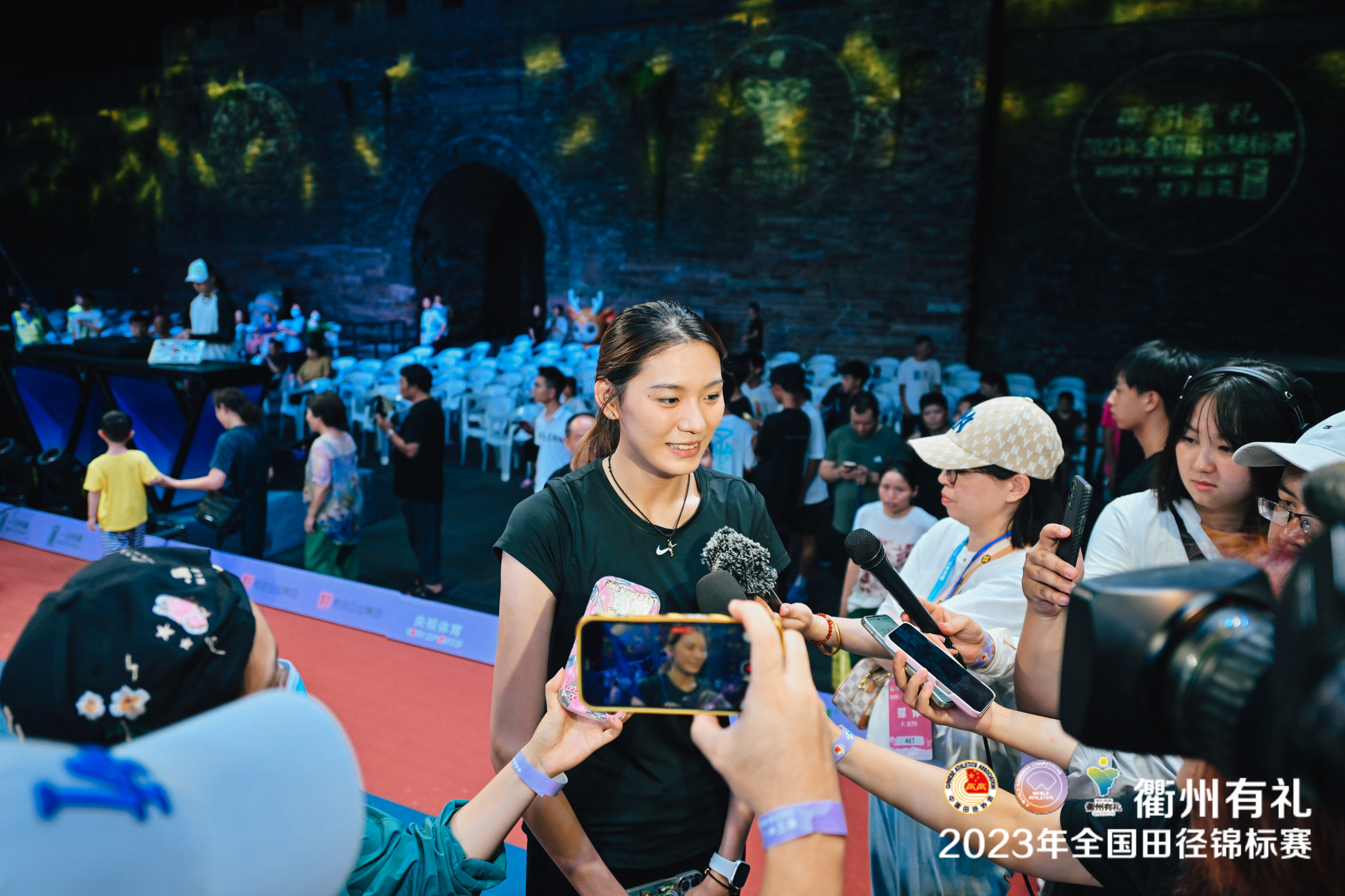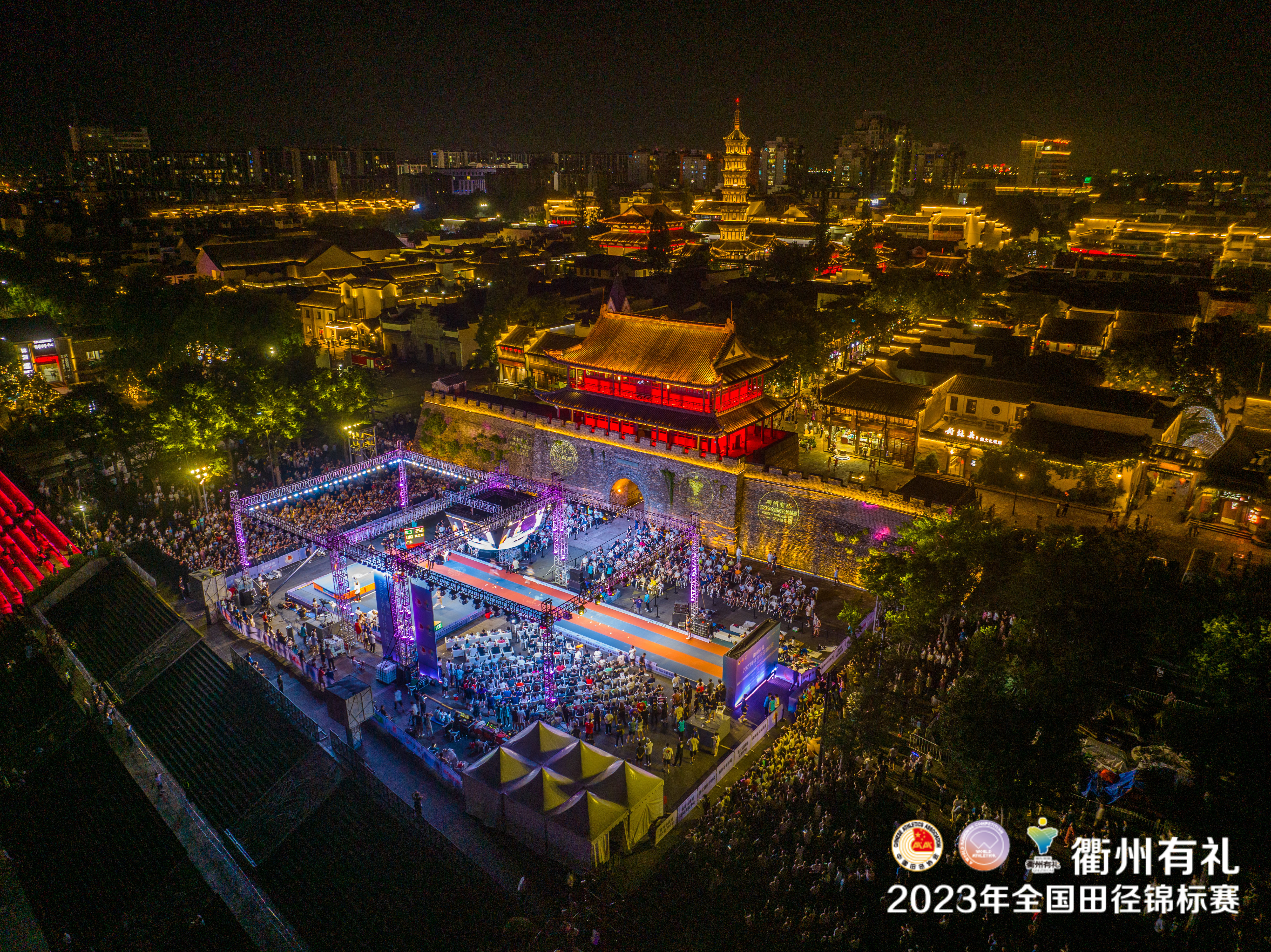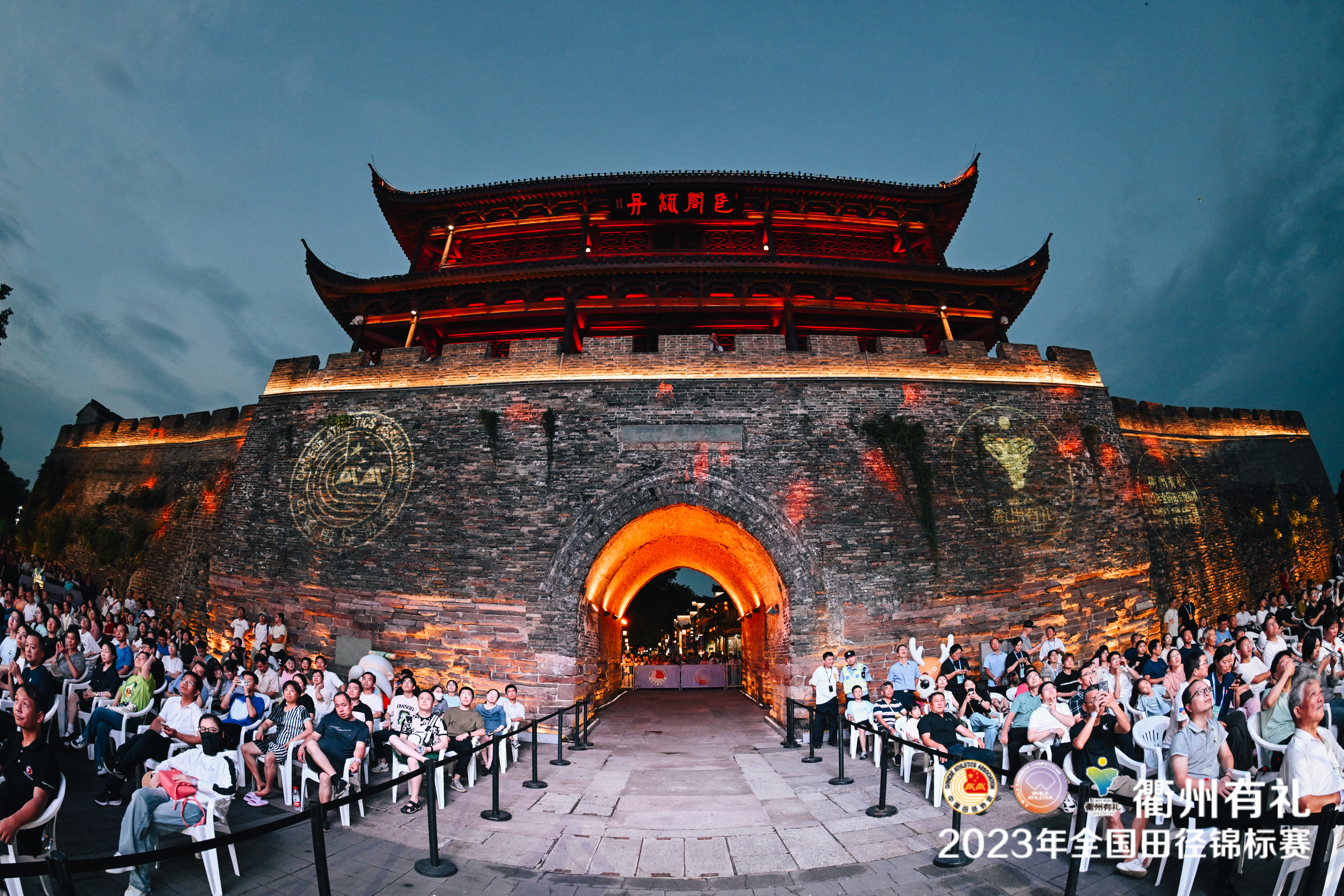 7月20日晚,“衢州有礼”2023年全国田径锦标赛女子跳高决赛率先举行,赛场被搬到了拥有600年历史的衢州古城墙“水亭门”之下。