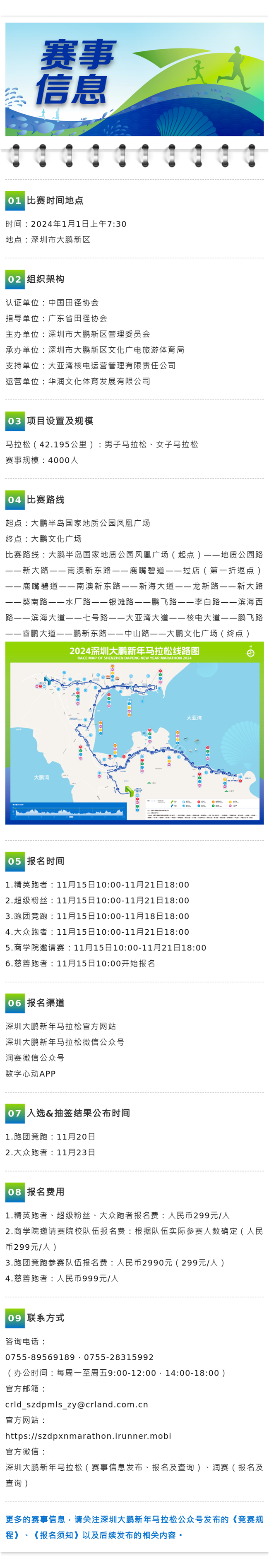 据悉,2024年1月1日上午7:30,2024深圳大鹏新年马拉松将在深圳大鹏半岛国家地质自然公园鸣枪起跑。赛事由深圳市大鹏新区管理委员会主办,深圳市大鹏新区文化广电旅游体育局承办,华润文化体育发展有限公司运营。