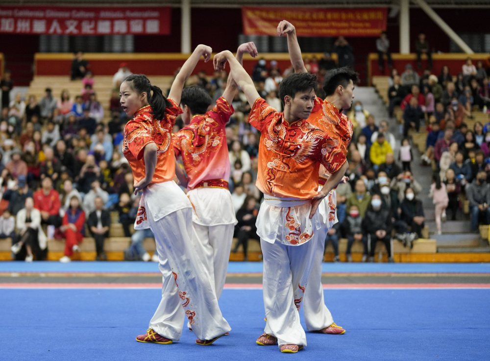 11月26日,在美国加州旧金山湾区的尤宁城,中国武术运动员进行交流表演。新华社记者 吴晓凌 摄