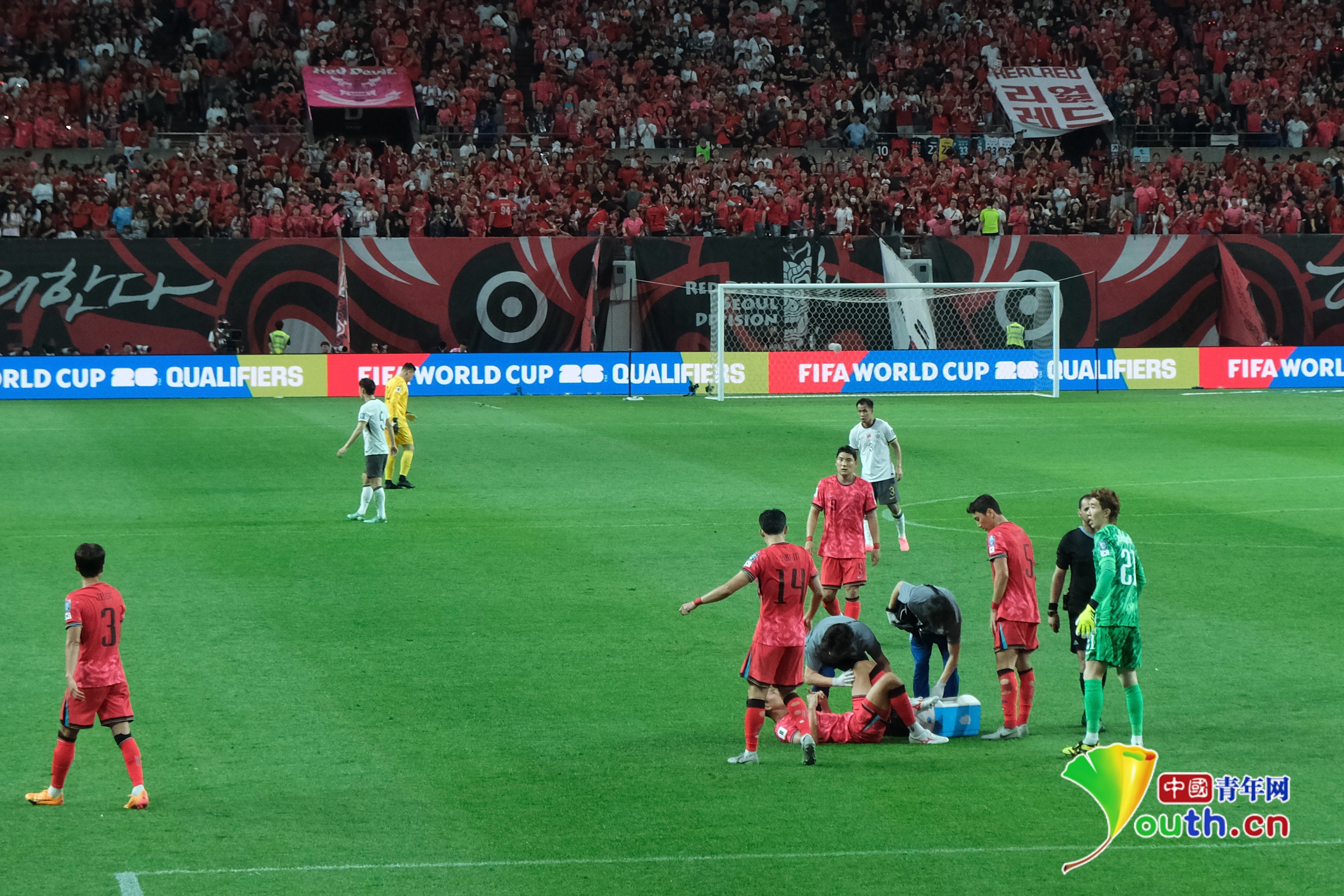 图为韩国球员受伤,队医进场处理杨逸凡/摄